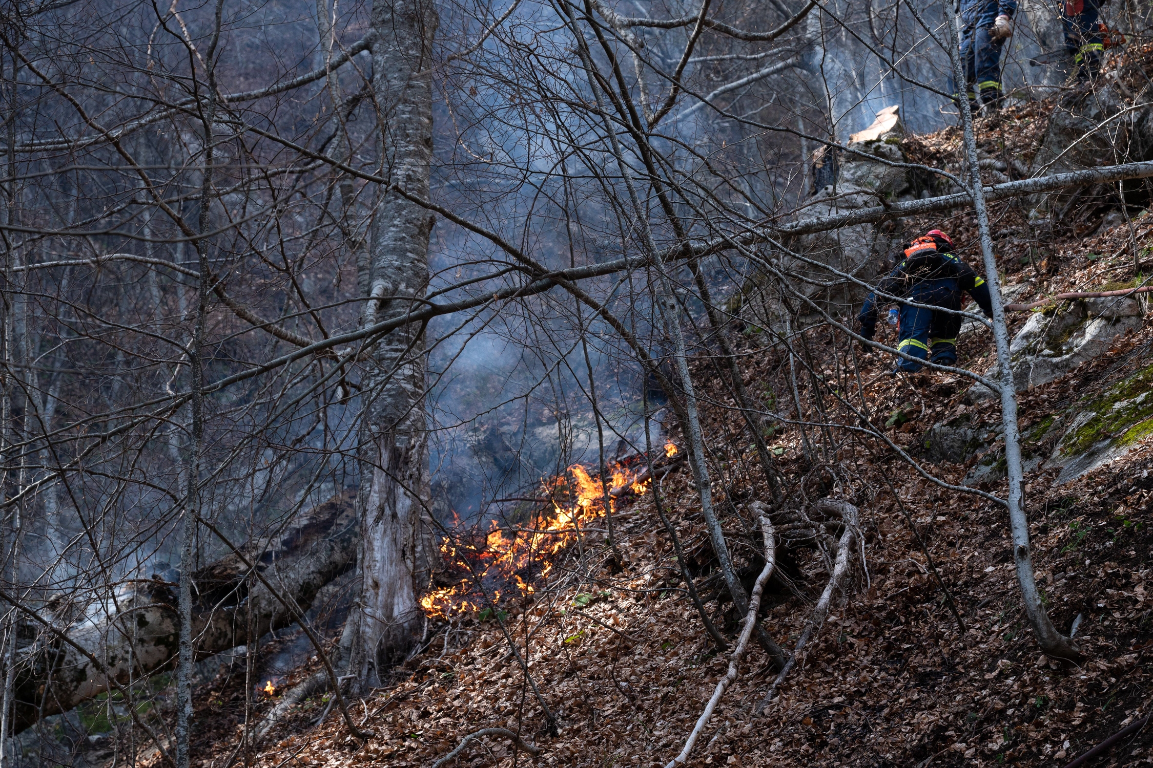 Επιχείρηση κατάσβεσης και περιορισμού της φωτιάς στην περιοχή Σαρακατσάνα στα Πιέρια Όρη, 2 Απριλίου 2024.