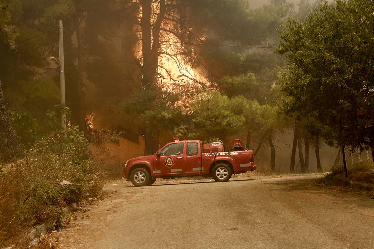 Πυροσβεστικό όχημα επιχειρεί στην κατάσβεση της πυρκαγιάς που ξέσπασε σε δασική περιοχή στη Σταμάτα, Αττικής, την Τρίτη 27 Ιουλίου 2021. Ενισχύονται οι πυροσβεστικές δυνάμεις που επιχειρούν για την κατάσβεση της μεγάλης πυρκαγιάς που εκδηλώθηκε το μεσημέρι μεταξύ Σταμάτας και Ροδόπολης και μαίνεται αυτή την ώρα. Στο σημείο επιχειρούν 68 πυροσβέστες με 22 οχήματα, 3 ομάδες πεζοπόρων τμημάτων, εθελοντές πυροσβέστες και υδροφόρες ΟΤΑ, ενώ τα εναέρια μέσα που συνδράμουν είναι 5 ελικόπτερα και 4 αεροσκάφη. Σημειώνεται, ότι την επιχείρηση συντονίζει ο αρχηγός του Πυροσβεστικού Σώματος, αντιστράτηγος Στέφανος Κολοκούρης, ενώ στην περιοχή μεταβαίνει κλιμάκιο της Διεύθυνσης Αντιμετώπισης Εγκλημάτων Εμπρησμού για τη διερεύνηση των αιτιών της πυρκαγιάς. ΑΠΕ-ΜΠΕ/ΑΠΕ-ΜΠΕ/ΓΙΑΝΝΗΣ ΚΟΛΕΣΙΔΗΣ