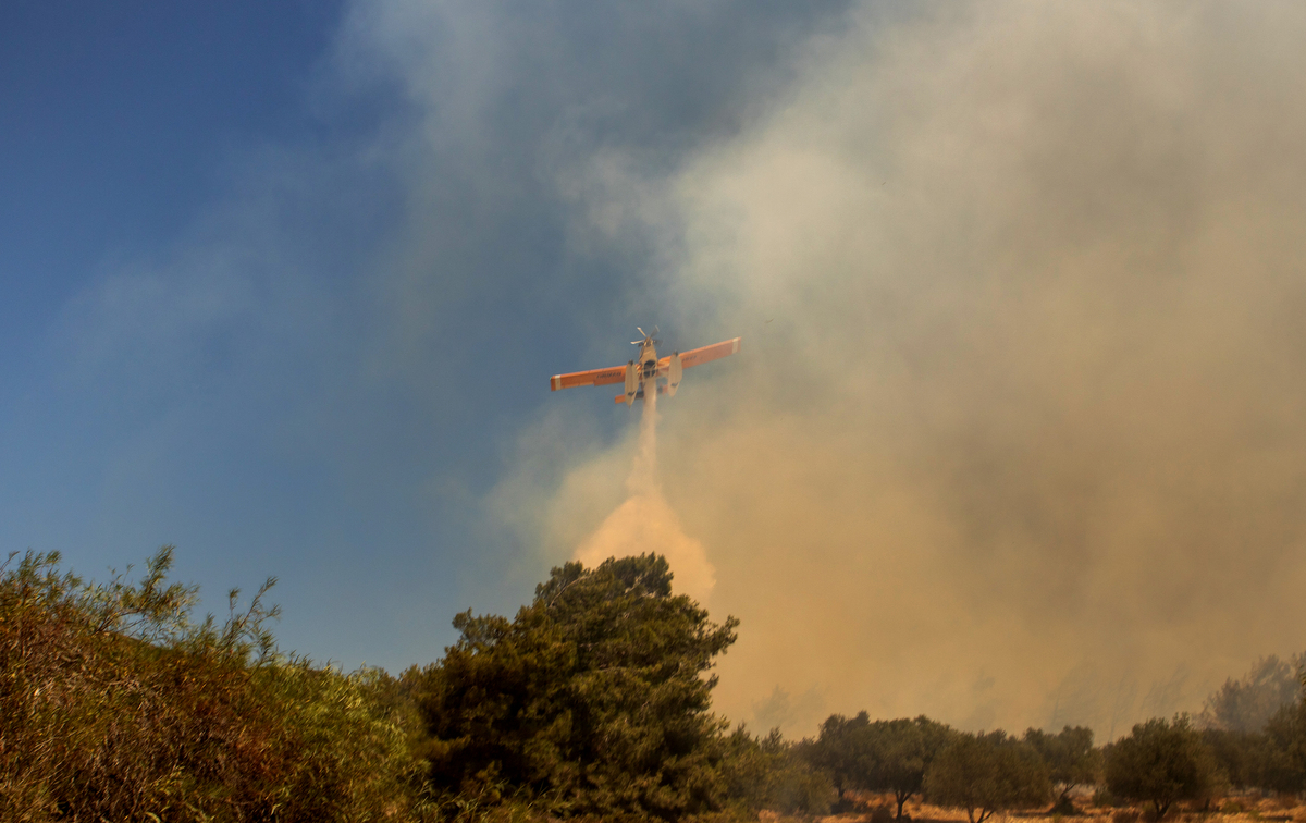 Πυροσβεστικό αεροσκάφος πραγματοποιεί ρίψεις νερού στην περιοχή Βάτι, στη Ρόδο, Τρίτη 25 Ιουλίου 2023. Σε Ρόδο και Κέρκυρα εξελίσσονται τα σοβαρότερα μέτωπα πυρκαγιών, ενώ στα υπόλοιπα μέτωπα αντιμετωπίζονται μέχρι στιγμής πολλές αναζωπυρώσεις, όπως ανέφερε σε έκτακτη ενημέρωση ο εκπρόσωπος Τύπου του Πυροσβεστικού Σώματος, αντιπύραρχος Γιάννης Αρτοποιός. Όπως επισήμανε, στη Ρόδο η αναζωπύρωση που εκδηλώθηκε από τις πρωινές ώρες στην περιοχή Βάτι έλαβε διαστάσεις και για αυτό το λόγο εκδόθηκε μήνυμα από το 112 για απομάκρυνση των κατοίκων προς Λίνδο και προσέθεσε ότι «επιχειρούν αδιάκοπα 266 πυροσβέστες 16 ομάδες πεζοπόρων τμημάτων, 55 υδροφόρα οχήματα, πλήθος εθελοντών, καθώς και όλοι οι φορείς της Πολιτικής Προστασίας, ενώ έχουν διατεθεί και δυνάμεις από το πρώτο φως της ημέρας, 9 αεροσκάφη και 4 ελικόπτερα». ΑΠΕ-ΜΠΕ/ΑΠΕ-ΜΠΕ/ ΛΕΥΤΕΡΗΣ ΔΑΜΙΑΝΙΔΗΣ