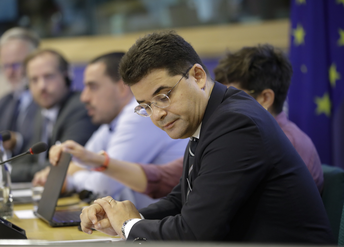 epa10169228 Greek Journalist Thanasis Koukakis attends a hearing by the European Parliament’s Inquiry Committee amid an investigation into the use of the Pegasus surveillance spyware in Greece, in Brussels, Belgium, 08 September 2022. EPA/OLIVIER HOSLET