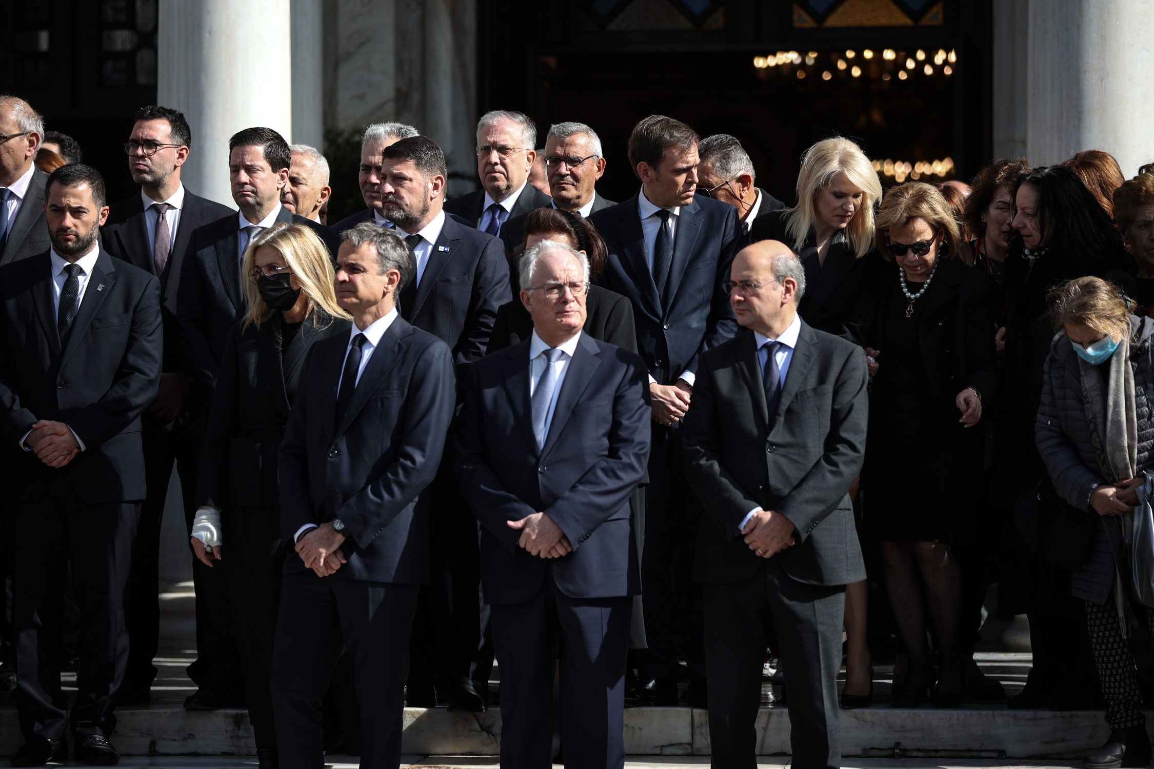 Την εξόδιο ακολουθία, που τελέσθηκε δημόσια δαπάνη, χοροστατούντος του αρχιεπισκόπου Αθηνών και Πάσης Ελλάδος Ιερωνύμου, παρακολούθησαν ο Πρόεδρος της Δημοκρατίας, Κωνσταντίνος Τασούλας, ο πρωθυπουργός Κυριάκος Μητσοτάκης -ο οποίοι εκφώνησαν επικήδειες ομιλίες- συνοδευόμενος από τη σύζυγό του Μαρίνα Γκραμπόφσκι, ο αντιπρόεδρος της Κυβέρνησης Κώστας Χατζηδάκης, η υπουργός Πολιτισμού Λίνα Μενδώνη, ο υπουργός Ανάπτυξης Άκης Θεοδωράκος και, μεταξύ άλλων, η υφυπουργός Μετανάστευσης, Σέφη Βολουδάκη, ο περιφερειάρχης Αττικής Νίκος Χαρδαλιάς, η πρώην Πρόεδρος της Δημοκρατίας Κατερίνα Σακελλαροπούλου, η Μαριάννα Λάτση, ο εφοπλιστής Θανάσης Μαρτίνος, ο αντιδήμαρχος Οικονομικού Προγραμματισμού του Δήμου Αθηναίων, Γιώργος Γιάνναρος, ο πρώην πρύτανης του ΕΚΠΑ, Θεόδωρος Φορτσάκης, ο νυν πρύτανης Γεράσιμος Σιάσος, ο περιφερειάρχης Στερεάς Ελλάδας, Φάνης Σπανός, ο Κοινοβουλευτικός Εκπρόσωπος του ΠΑΣΟΚ, Δημήτρης Μάντζιος, ο πρώην υπουργός Άμυνας, Νίκος Αποστολάκης, η βουλευτής Θεοδώρα Τζάκρη, η πρώην υπουργός Άντζελα Γκερέκου κι από τον καλλιτεχνικό κόσμο ο Γιώργος Νταλάρας κι η Μιμή Ντενίση.