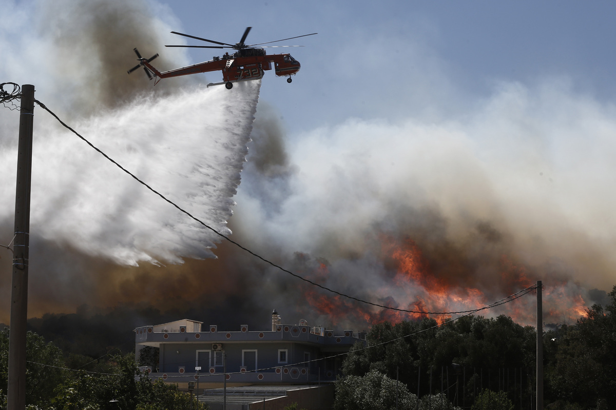 Πυροσβεστικό ελικόπτερο πραγματοποιεί ρίψεις νερού κατά τη διάρκεια πυρακαγιάς στον οικισμό Κίτσι Κορωπίου, την Τετάρτη 19 Ιουνίου 2024. Δεν υπάρχει πλέον ενιαίο μέτωπο αλλά πολλά μικρότερα σε ό,τι αφορά την πυρκαγιά στην περιοχή της λεωφόρου Βάρης – Κορωπίου. Τη φωτιά συντηρούν οι πολύ ισχυροί άνεμοι που πνέουν στην περιοχή και ήδη έχει προκαλέσει ζημιές σε βιομηχανίες και κάποιες διάσπαρτες κατοικίες τη περιοχής. ΑΠΕ-ΜΠΕ/ΑΠΕ-ΜΠΕ/ΓΙΑΝΝΗΣ ΚΟΛΕΣΙΔΗΣ