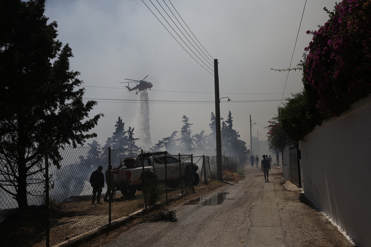 Πυροσβέστικό ελικόπτερο επιχειρεί στην κατάσβεση πυρκαγιάς που έχει ξεσπάσει στην περιοχή Άγιος Δημήτριος Κορωπίου, την Παρασκευή 4 Ιουλίου 2025. Ενισχύθηκαν οι δυνάμεις που επιχειρούν στην πυρκαγιά που ξέσπασε σήμερα γύρω στις 13.15 σε χαμηλή βλάστηση στην περιοχή Άγιος Δημήτριος Κορωπίου. Όπως έγινε γνωστό από την Πυροσβεστική, η πυρκαγιά έχει παρόμοια χαρακτηριστικά με τη χθεσινή στη Ραφήνα, καθώς εξελίσσεται σε κατοικημένη περιοχή και έχει κατεύθυνση προς τη θάλασσα. Επιπλέον στις 13.48 εκδόθηκε μήνυμα του 112 για την απομάκρυνση των κατοίκων από τους οικισμούς Άγιος Δημήτριος, Γαλάζια Ακτή και Αλθέα. Για την κατάσβεση της φωτιάς έχουν κινητοποιηθεί 84 πυροσβέστες με 5 ομάδες πεζοπόρων τμημάτων και 28 οχήματα ενώ από αέρος ρίψεις νερού πραγματοποιούν 8 ελικόπτερα και 8 αεροσκάφη, εκ των οποίων το ένα για συντονισμό. Συνδρομή παρέχουν υδροφόρες ΟΤΑ. ΑΠΕ-ΜΠΕ/ΑΠΕ-ΜΠΕ/ΓΙΑΝΝΗΣ ΚΟΛΕΣΙΔΗΣ