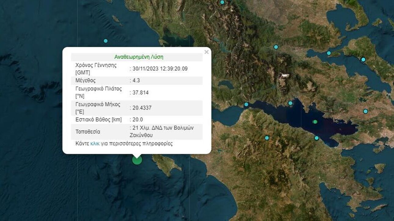 Σεισμική δόνηση μεγέθους 4,3 βαθμών της κλίμακας Ρίχτερ «ταρακούνησε» τη Ζάκυνθο λίγο πριν τις 15:00 της Πέμπτης (30/11).