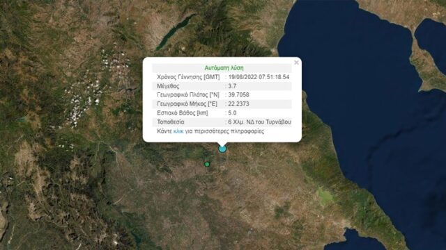 Σεισμική δόνηση μεγέθους 3,7 βαθμών της Κλίμακας Ρίχτερ σημειώθηκε στις 10:54 το πρωί της Παρασκευής (19/8) στον Τύρναβο Θεσσαλίας.