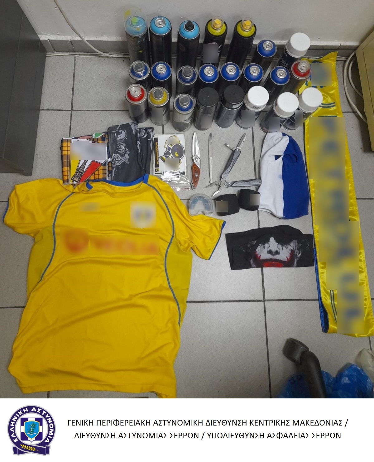 Ειδικότερα, σε αστυνομικό έλεγχο του οχήματος στο οποίο επέβαιναν κατά την είσοδό τους στη χώρα βρέθηκαν στην κατοχή τους και κατασχέθηκαν: δύο μαχαίρια, ένα πολυεργαλείο με μαχαίρι, 23 σπρέι βαφής, μία μάσκα τύπου full face, εξοπλισμός πυγμαχίας (περικάρπια, μασελάκι) και φανέλα, κασκόλ και άλλα αντικείμενα που έφεραν τα διακριτικά αθλητικού συλλόγου της αλλοδαπής (φέρεται να είναι οπαδοί της Πετρολούλ).