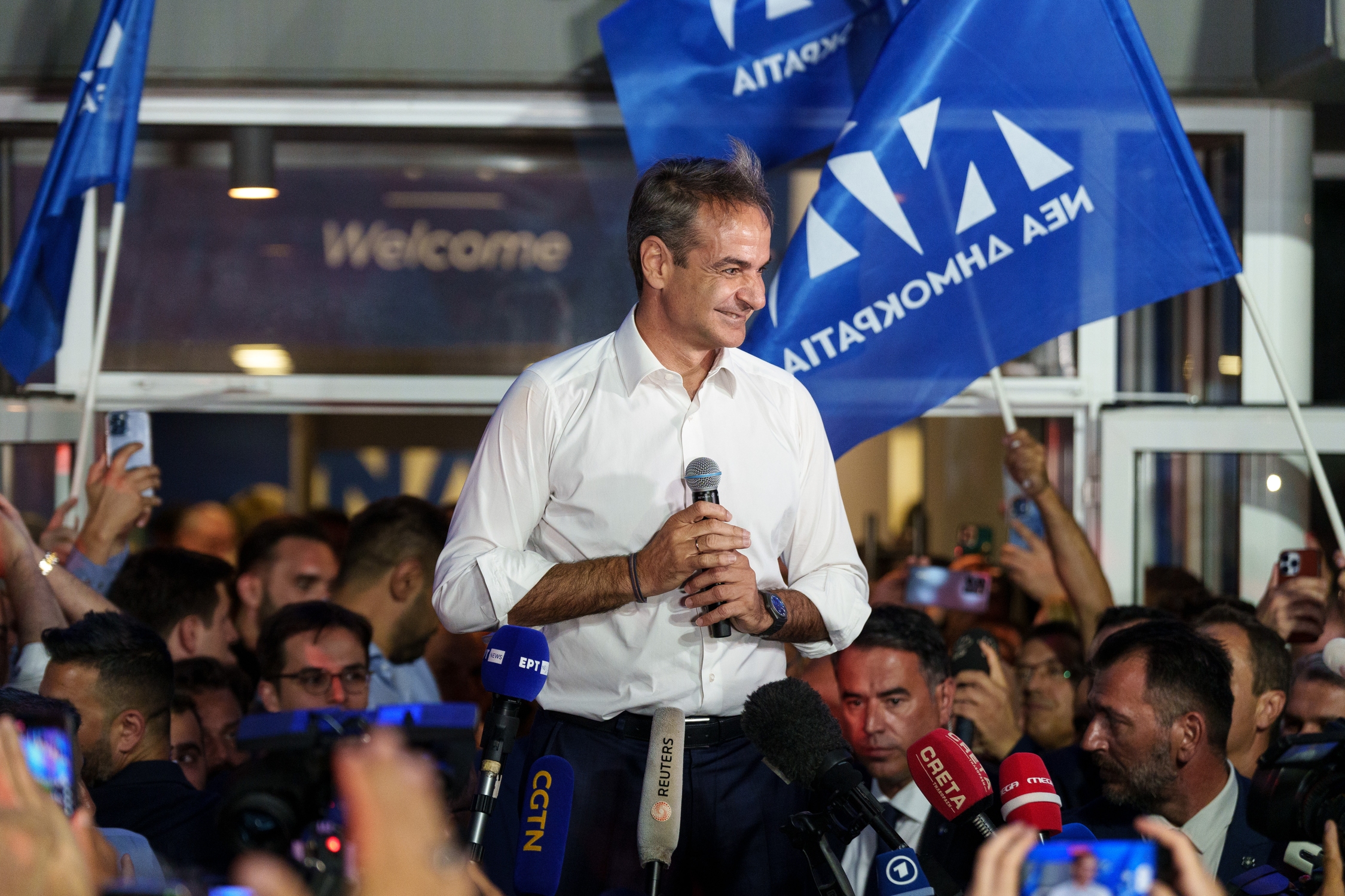 New Democracy Party leader Kyriakos Mitsotakis, celebrates with supporters of the Party after winning the parliamentary elections, in Athens, Greece on June 25, 2023 / Δηλώσεις του Κυριάκου Μητσοτάκη μετά την νίκη της Νέας δημοκρατίας στις εκλογές της 25ης Ιουνίου, 2023.