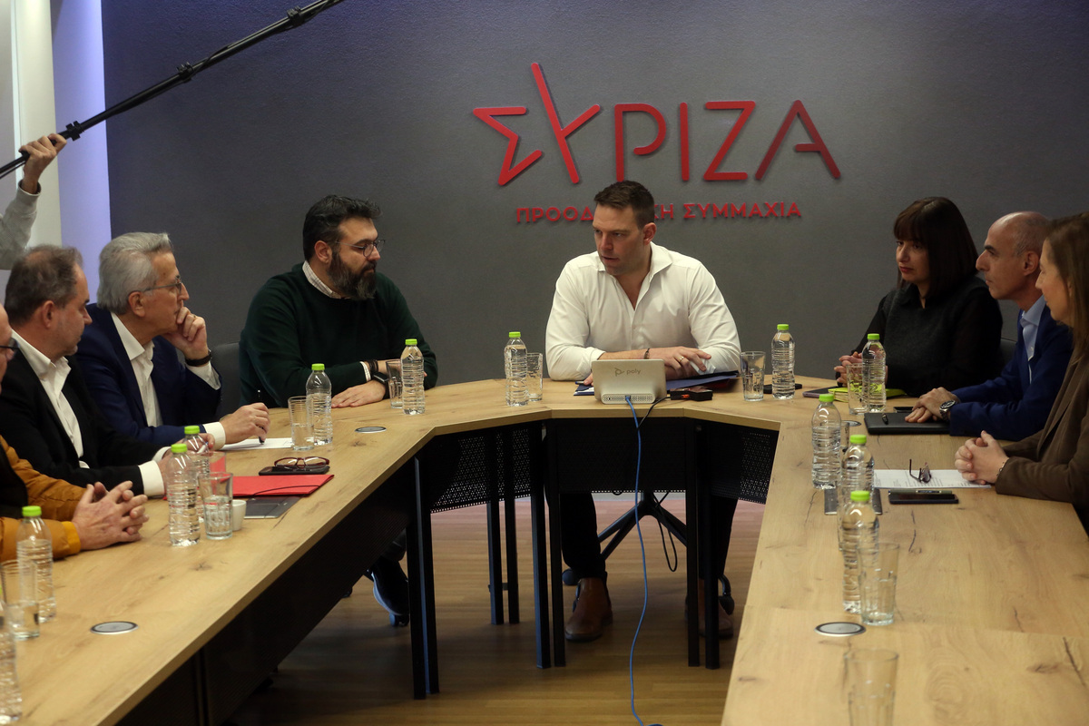 Ο πρόεδρος του ΣΥΡΙΖΑ – ΠΣ Στέφανος Κασσελάκης, οι βουλευτές Μαριλίζα Ξενογιαννακοπούλου και Γιώργος Γαβρίλης, η γραμματέας του κόμματος Ράνια Σβίγκου (3Δ) και ο αναπληρωτής γραμματέας Γιώργος Βασιλειάδης συναντώνται με το προεδρείο της ΓΣΕΕ, στα γραφεία του κόμματος, Αθήνα, Πέμπτη 1 Φεβρουαρίου 2024. ΑΠΕ-ΜΠΕ/Αλέξανδρος Μπελτές