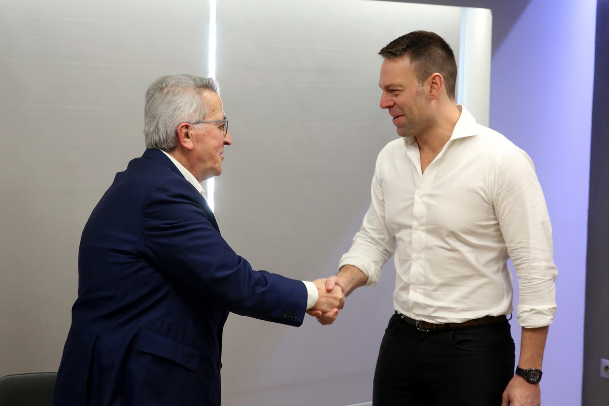 Ο πρόεδρος του ΣΥΡΙΖΑ – ΠΣ Στέφανος Κασσελάκης υποδέχεται τον πρόεδρο της ΓΣΕΕ Γιάννη Παναγόπουλο κατά τη συνάντησή του με το προεδρείο της ΓΣΕΕ στα γραφεία του κόμματος, Αθήνα, Πέμπτη 1 Φεβρουαρίου 2024. ΑΠΕ-ΜΠΕ/Αλέξανδρος Μπελτές
