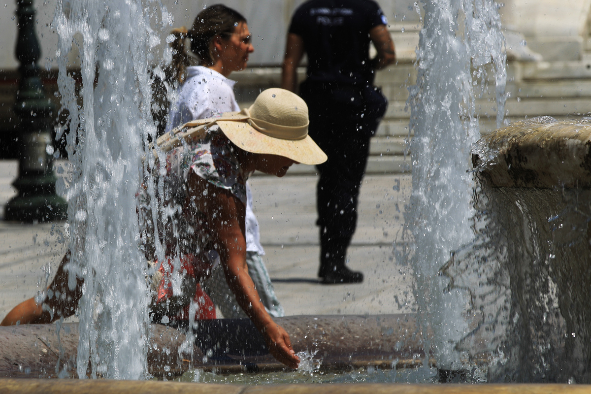 Γυναίκα δροσίζεται με το νερό από to συντριβάνι στην πλατεία Συντάγματος, κατά τη διάρκεια του καύσωνα, Σάββατο 15 Ιουλίου 2023. Σε ρυθμούς πολύ υψηλών θερμοκρασιών κινείται εδώ και 4 μέρες η χώρα με το θερμόμετρο να έχει χτυπήσει «κόκκινο» φτάνοντας τους 42, 43 αλλά και 44 βαθμούς Κελσίου σε κάποιες περιοχές λόγω της "επέλασης" του καύσωνα με την ονομασία «Κλέων». ΑΠΕ-ΜΠΕ/ΑΠΕ-ΜΠΕ/ΑΛΕΞΑΝΔΡΟΣ ΒΛΑΧΟΣ ΑΠΕ- ΜΠΕ/ΑΠΕ- ΜΠΕ/ΑΛΕΞΑΝΔΡΟΣ ΒΛΑΧΟΣ