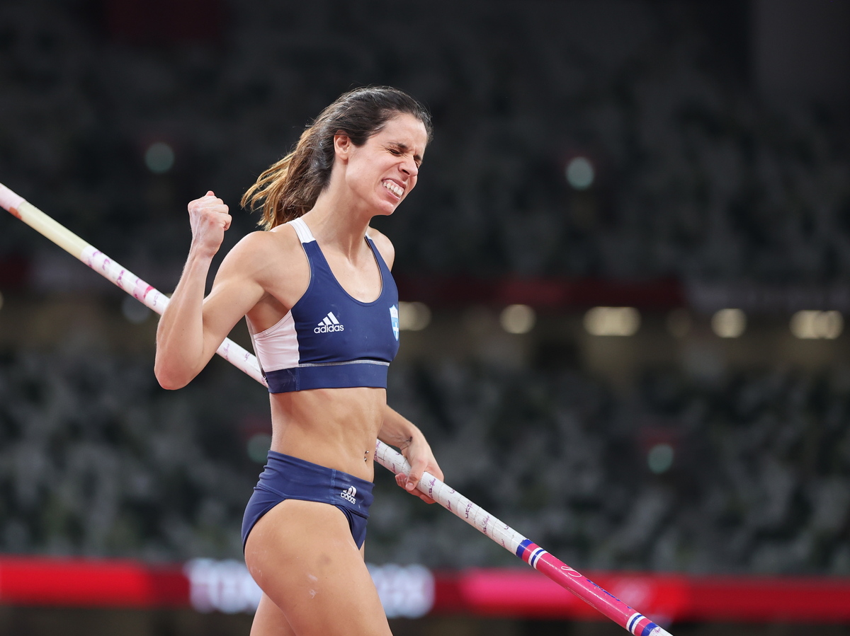 epa09398112 Katerina Stefanidi of Greece competes in the Women's Pole Vault Final during the Athletics events of the Tokyo 2020 Olympic Games at the Olympic Stadium in Tokyo, Japan, 05 August 2021. EPA/DIEGO AZUBEL