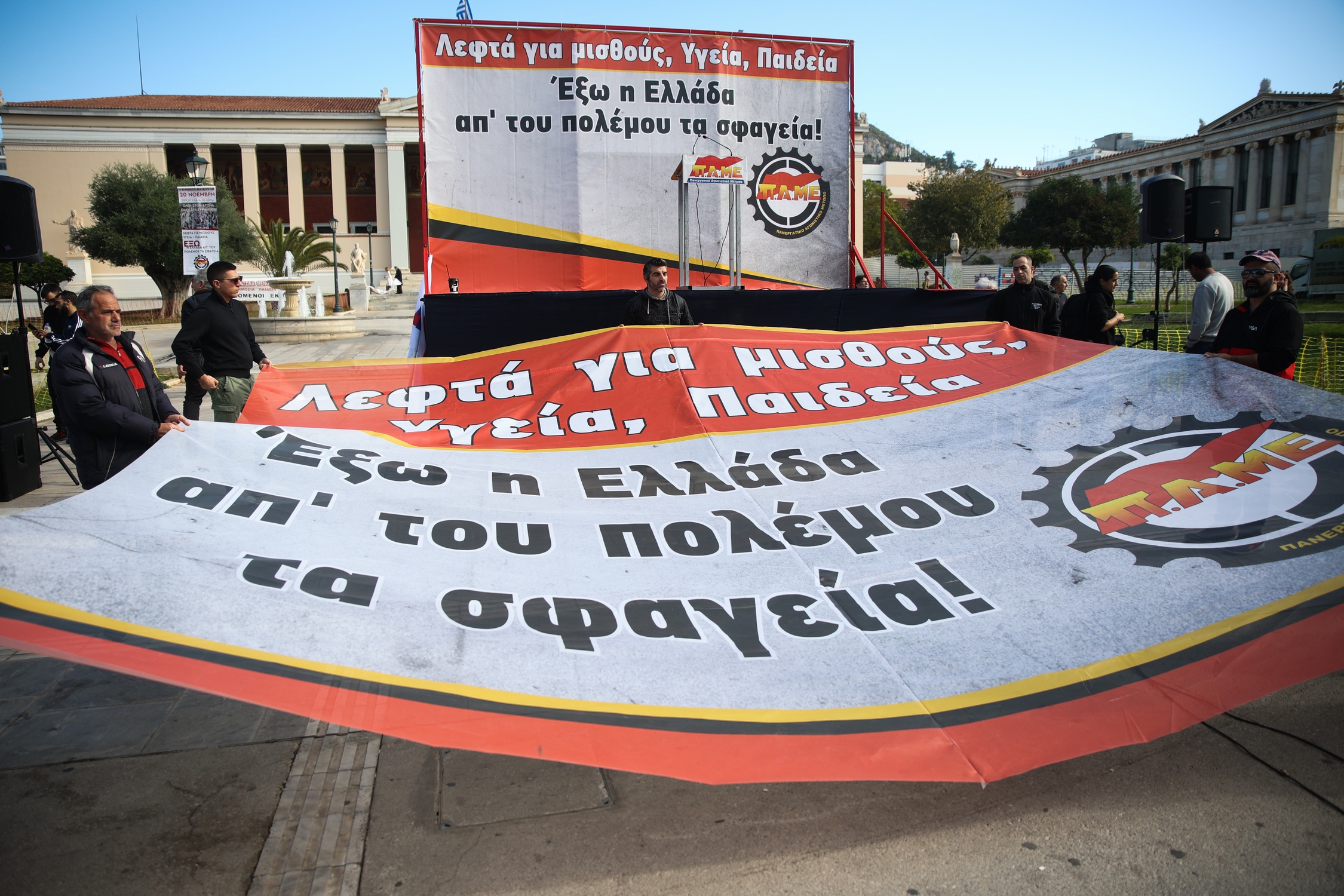 «Σήμερα οι εργατοϋπάλληλοι όλης της χώρας στέλνουν ένα ισχυρό και ξεκάθαρο μήνυμα προς κάθε κατεύθυνση: Δώστε λεφτά για μισθούς, για την παιδεία, για την υγεία και όχι για των πολέμων τα σφαγεία», δήλωσε ο γγ της ΚΕ του ΚΚΕ, Δημήτρης Κουτσούμπας, στην απεργιακή συγκέντρωση Εργατικών Κέντρων, Ομοσπονδιών και Συνδικάτων στα Προπύλαια.