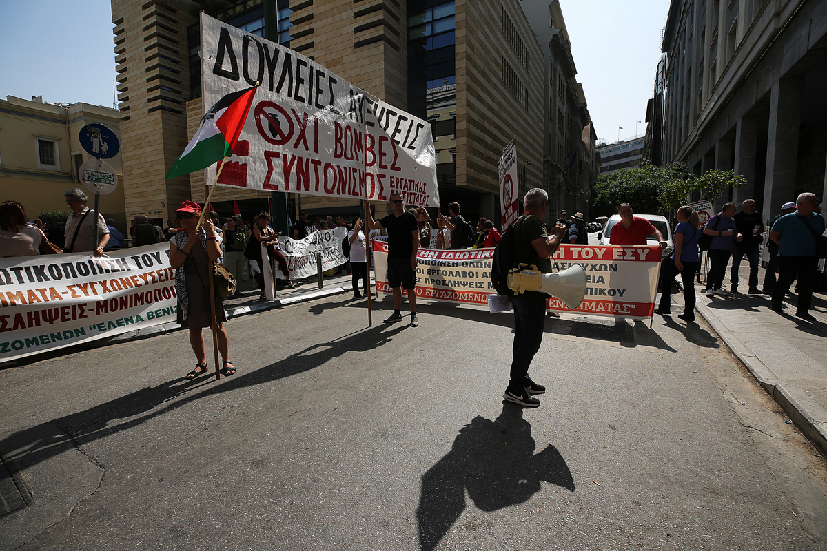 Εργαζόμενοι σε δημόσιους φορείς πραγματοποιούν συγκέντρωση διαμαρτυρίας έξω από το ΣτΕ, όπου διεξάγεται η πρότυπη δίκη για την επαναφορά του 13ου και του 14ου μισθού στο Δημόσιο, στο πλαίσιο της πανελλαδικής στάσης εργασίας που κήρυξε η Εκτελεστική Επιτροπή της ΑΔΕΔΥ, Αθήνα, Παρασκευή 6 Ιουνίου 2025. ΑΠΕ-ΜΠΕ/ΑΛΕΞΑΝΔΡΟΣ ΒΛΑΧΟΣ