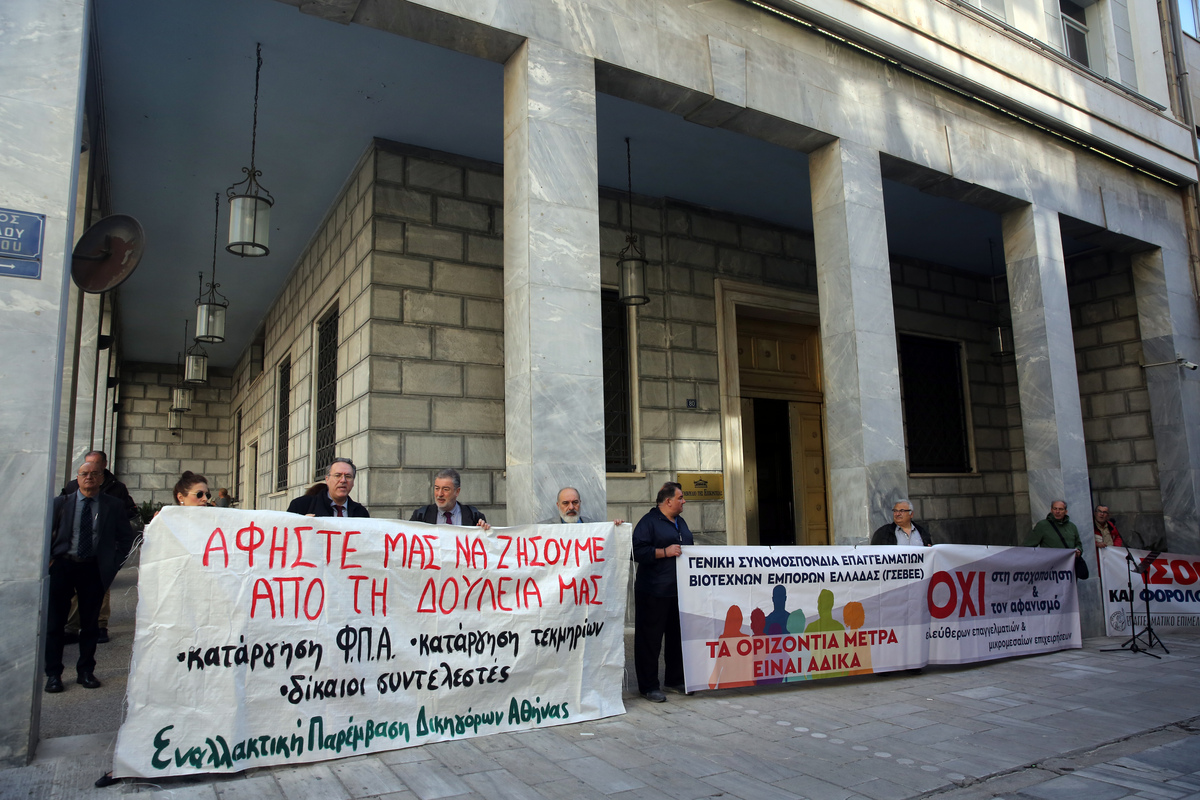 Στο μεταξύ, συγκέντρωση έξω από το ΣτΕ πραγματοποίησαν ελεύθεροι επαγγελματίες, επιστήμονες, έμποροι και επαγγελματοβιοτεχνες, κ.λπ. Η συγκέντρωση, διοργανώθηκε από την Συντονιστική Επιτροπή Ελευθέρων Επαγγελματιών – Επιστημόνων – Επαγγελματοβιοτεχνών και Εμπόρων, ενώ ο Δικηγορικός Σύλλογος Αθηνών έχει κηρύξει καθολική αποχή των δικηγόρων της Αθήνας από τα καθήκοντα τους.