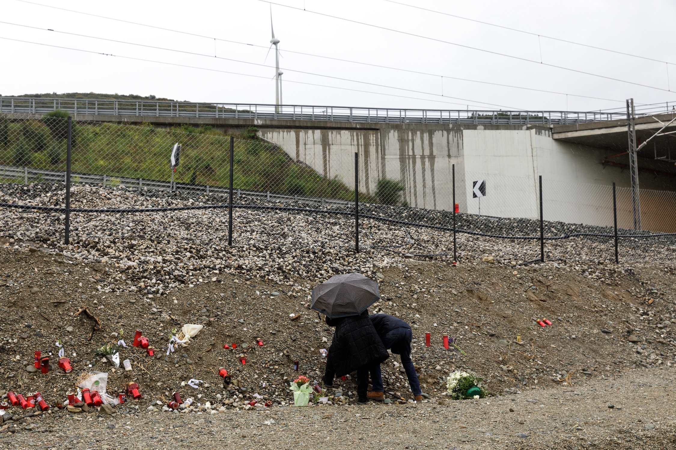 Relatives of a victim lay flowers at the site of the train accident in Tempi where 57 people died on February 28 after a head-on collision between a passenger and a cargo train, Larissa, Greece on April 3, 2023. After 34 days from the day of the rail accident, train services between Athens and Thessaloniki resumed. / Συγγενείς θύματος αφήνουν λουλούδια στο σημείο του σιδηροδρομικού δυστυχήματος στα Τέμπη όπου 57 άνθρωποι έχασαν τη ζωή του στις 28 Φεβρουαρίου μετά από μετωπική σύγκρουση επιβατικής και εμπορικής αμαξοστοιχίας, Λάρισα, 3 Απριλίου 2023. Έπειτα απο 34 ημέρες από την ημέρα του σιδηροδρομικού δυστυχήματος ξεκίνησαν ξανά τα δρομολόγια τρένου μεταξύ Αθήνας και Θεσσαλονίκης.