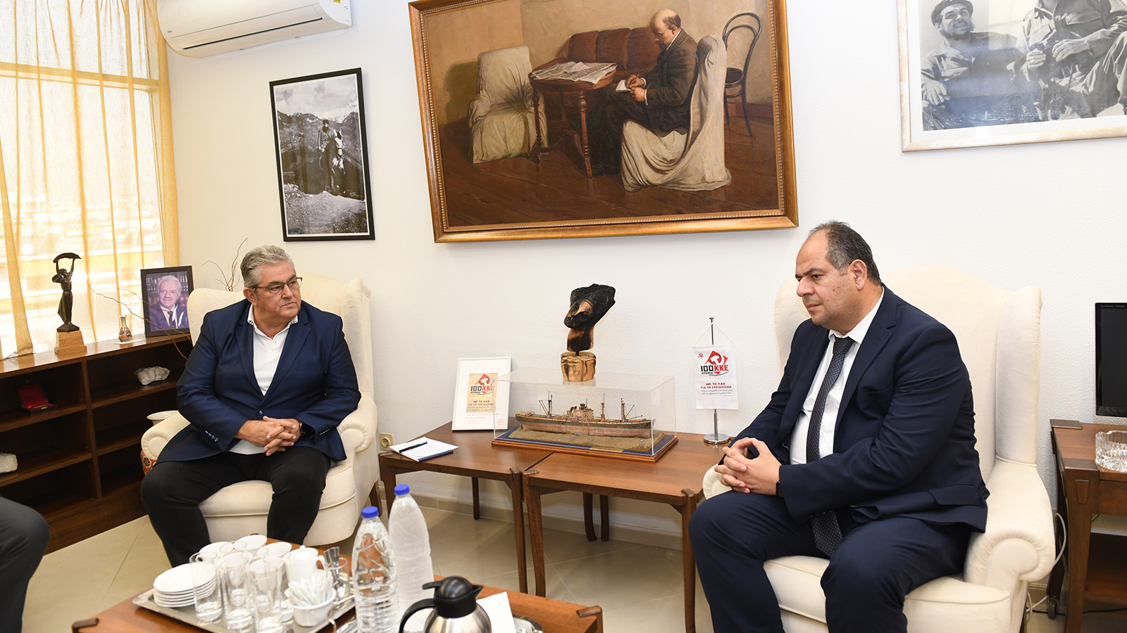 Ο γγ της ΚΕ του ΚΚΕ Δημήτρης Κουτσούμπας συναντήθηκε σήμερα, στην έδρα της ΚΕ του κόμματος στον Περισσό, με τον Παλαιστίνιο πρέσβη στην Ελλάδα Γιουσέφ Ντορχόμ. Στη συνάντηση συμμετείχε ακόμα ο Γιώργος Μαρίνος, μέλος του ΠΓ της ΚΕ και βουλευτής του ΚΚΕ.