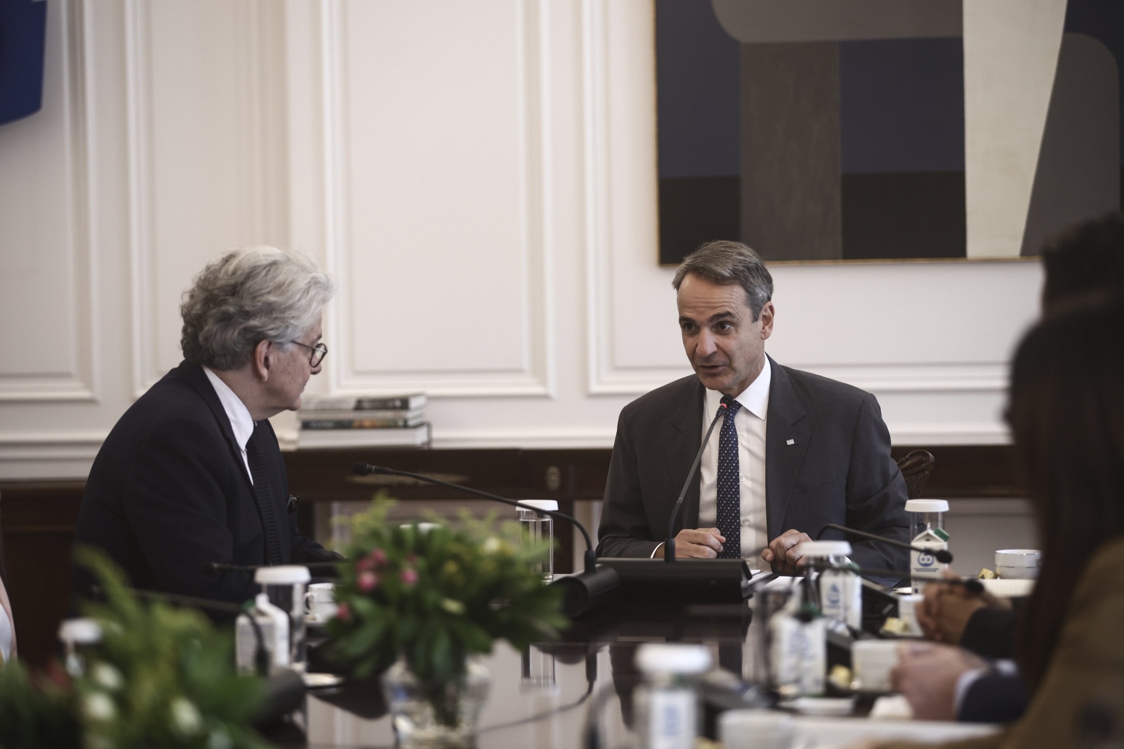 Συνάντηση του Πρωθυπουργού Κυριάκου Μητσοτάκη με τον Επίτροπο Εσωτερικής Αγοράς της ΕΕ Thierry Breton , στο Μέγαρο Μαξίμου , στην Αθήνα , στις 20 Ιουνίου , 2024