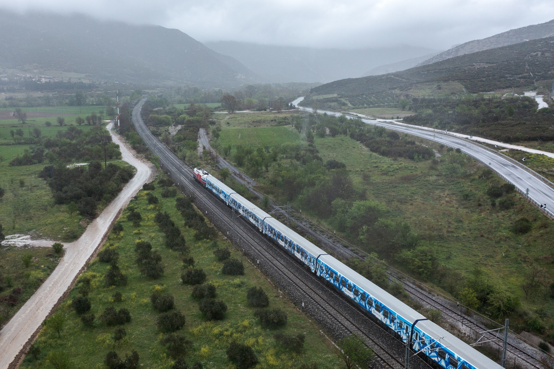 Passenger train IC52 (Athens - Thessaloniki) passes the site of the train accident in Tempi where 57 people died on February 28 after a head-on collision between a passenger and a cargo train, Larissa, Greece on April 3, 2023. After 34 days from the day of the rail accident, train services between Athens and Thessaloniki resumed./ Η επιβατική αμαξοστοιχία IC52 ( Αθήνα - Θεσσαλονίκη) διέρχεται από το σημείο του σιδηροδρομικού δυστυχήματος στα Τέμπη όπου 57 άνθρωποι έχασαν τη ζωή του στις 28 Φεβρουαρίου μετά από μετωπική σύγκρουση επιβατικής και εμπορικής αμαξοστοιχίας, Λάρισα, 3 Απριλίου 2023. Έπειτα απο 34 ημέρες από την ημέρα του σιδηροδρομικού δυστυχήματος ξεκίνησαν ξανά τα δρομολόγια τρένου μεταξύ Αθήνας και Θεσσαλονίκης.