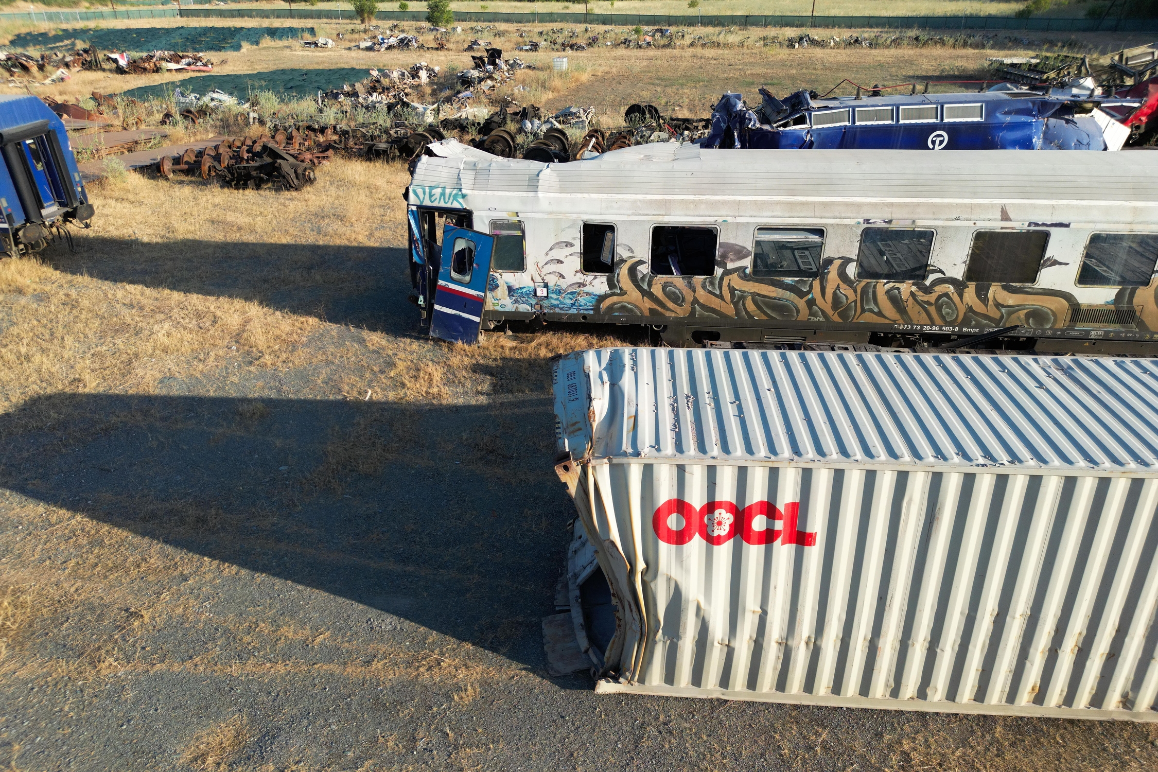 Το κοντέινερ της εμπορικής αμαξοστοιχίας που ενεπλάκη στο πολύνεκρο δυστύχημα των Τεμπών στον ειδικό χώρο που φυλάσσονται τα συντρίμμια του δυστυχήματος στο Κουλούρι Λάρισας, 28 Ιουνίου 2024.