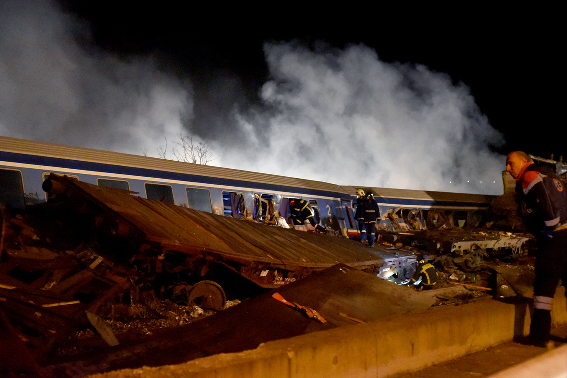 Kατεστραμμένα βαγόνια των τραίνων που συγκρούστηκαν έξω από την Λάρισα, Τετάρτη 1 Μαρτίου 2023. Μία επιβατική αμαξοστοιχία συγκρούσθηκε με μία εμπορευματική έξω από τη Λάρισα, ενώ εκτροχιάστηκαν τα δύο πρώτα βαγόνια της επιβατικής αμαξοστοιχίας και εκδηλώθηκε πυρκαγιά. Τουλάχιστον δεκαέξι άνθρωποι έχασαν τη ζωή τους και άλλοι 85 τραυματίστηκαν, πολλοί από τους οποίους βρίσκονται σε σοβαρή κατάσταση, στη σύγκρουση επιβατικής με εμπορευματική αμαξοστοιχία στα Τέμπη αργά το βράδυ της Τρίτης, σύμφωνα με επίσημη ενημέρωση από εκπρόσωπο της Πυροσβεστικής.Το τραγικό δυστύχημα έγινε στην περιοχή Ευαγγελισμός, σε μικρή απόσταση από τη Λάρισα και τα Τέμπη.ΑΠΕ-ΜΠΕ/ΑΠΕ-ΜΠΕ/ΑΠΟΣΤΟΛΗΣ ΝΤΟΜΑΛΗΣ