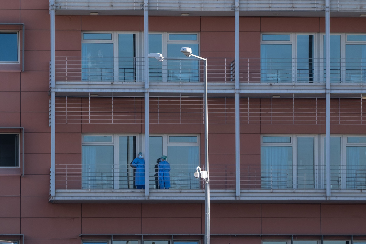 Μέλη του υγειονομικού προσωπικού στέκονται σε μπαλκόνι του 424 Στρατιωτικού Νοσοκομείου Θεσσαλονίκης, Δευτέρα 23 Νοεμβρίου 2020, Στη δημιουργία κινητής υγειονομικής μονάδας εκτάκτων αναγκών στον προαύλιο χώρο του 424 Γενικού Στρατιωτικού Νοσοκομείου στη Θεσσαλονίκη προχωρά το Γενικό Επιτελείο Στρατού μετά από απόφαση της πολιτικής και στρατιωτικής ηγεσίας. Η μονάδα θα διαθέτει 50 κλίνες νοσηλείας και ακτινολογικό εργαστήριο, το οποίο είναι απαραίτητο για τη διάγνωση επιπτώσεων του κορονοϊού στον θώρακα ενώ διευκρινίζεται ότι η κινητή μονάδα δεν θα διαθέτει Μονάδα Εντατικής Θεραπείας. Στόχος είναι να μπορεί η μονάδα να δεχτεί - εφόσον απαιτηθεί - ασθενείς, προκειμένου να εξοικονομηθεί χώρος για ασθενείς με κορονοϊό εντός του νοσοκομείου. ΑΠΕ-ΜΠΕ/ΑΠΕ-ΜΠΕ/ΝΙΚΟΣ ΑΡΒΑΝΙΤΙΔΗΣ