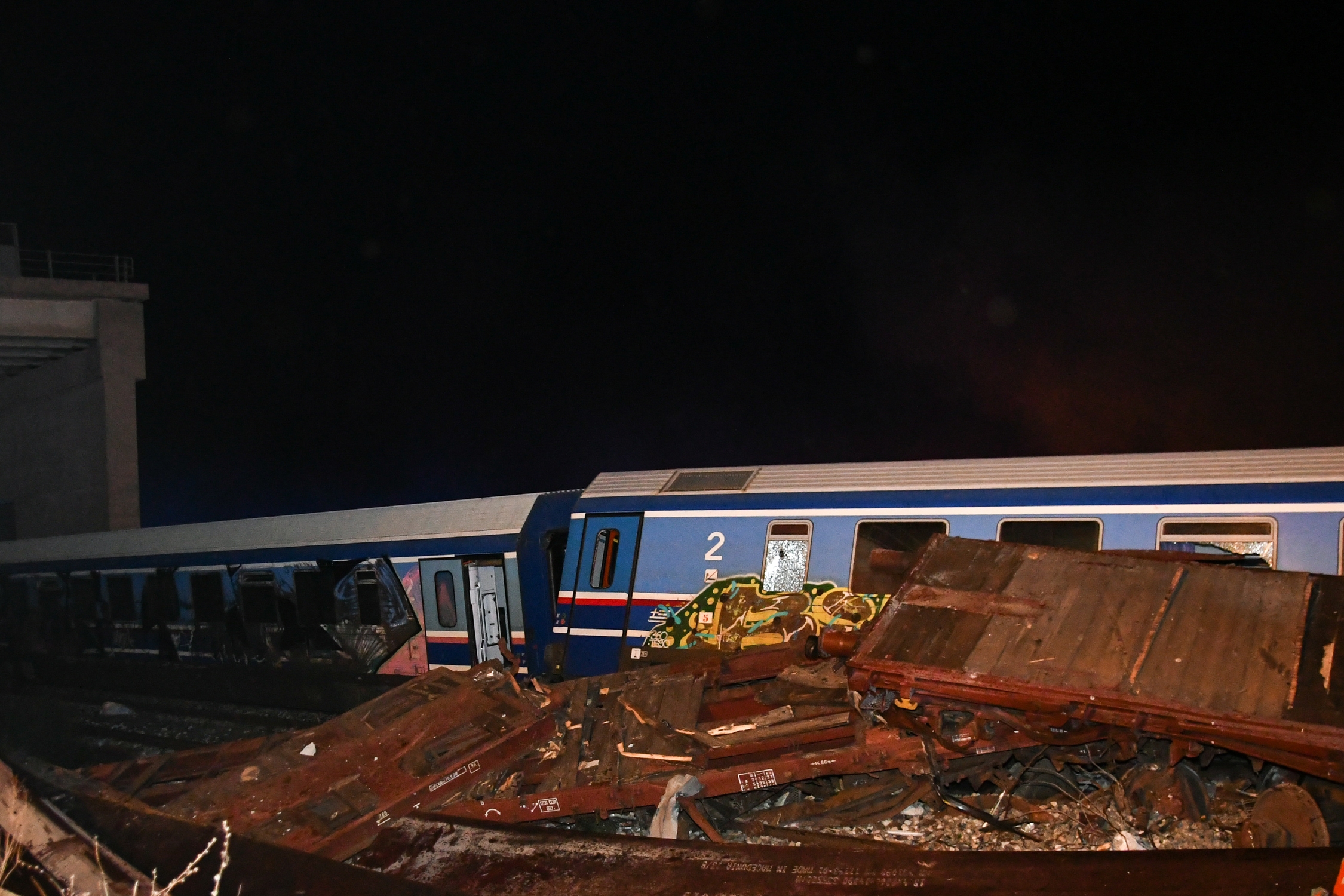 Rail accident involving a collision between a cargo and a passenger train in the Evangelismos area of Larissa, Greece on March 1, 2023. / Σιδηροδρομικό ατύχημα με σύγκρουση μιας εμπορικής και μιας επιβατικής αμαξοστοιχίας στην περιοχή Ευαγγελισμός Λάρισας, 1 Μαρτίου 2023.
