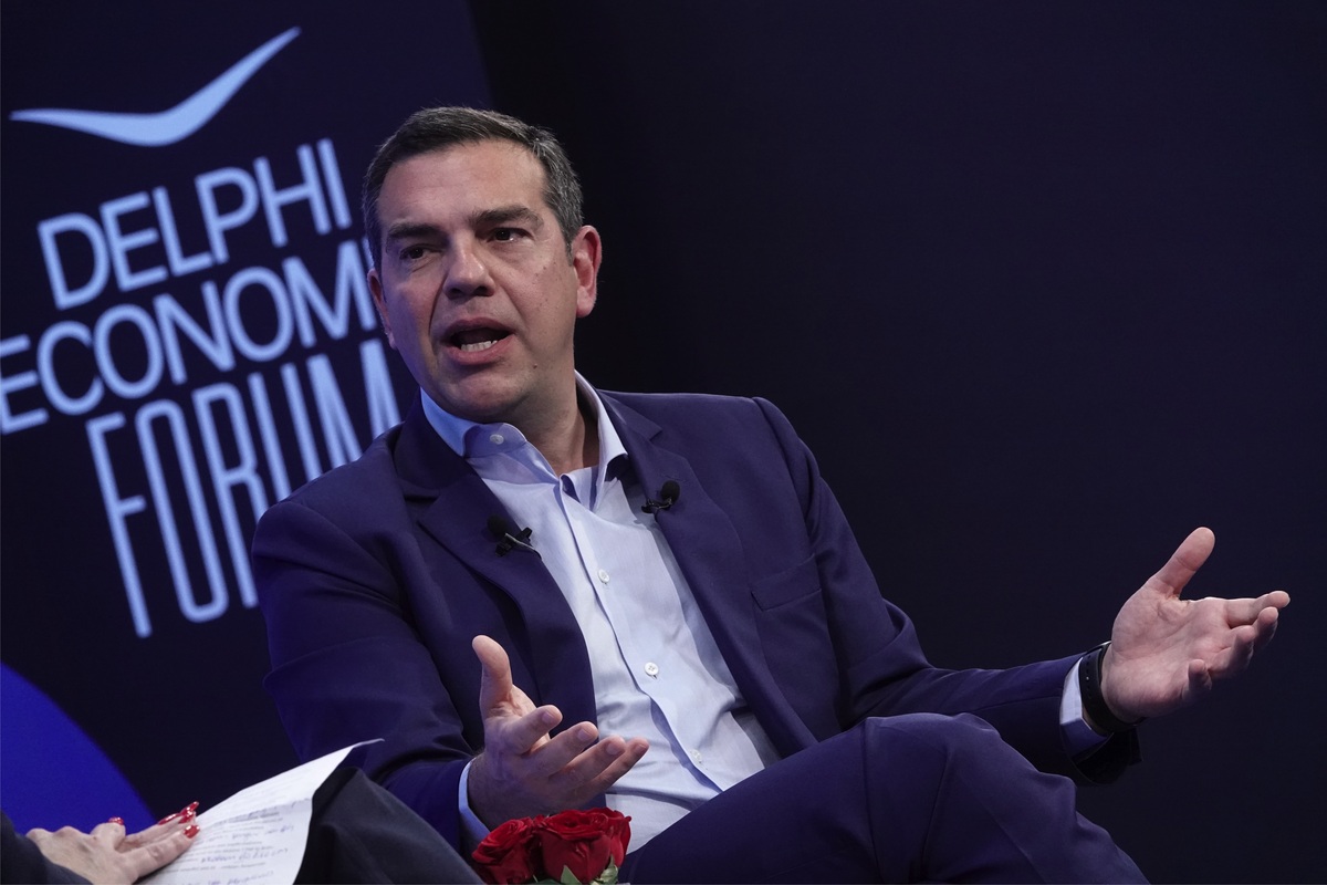 Ο πρόεδρος του ΣΥΡΙΖΑ - Προοδευτική Συμμαχία , Αλέξης Τσίπρας μιλά με τη δημοσιογράφο Μαρία Νικόλτσιου κατά την 1η ημέρα του 8ου Οικονομικού Φόρουμ των Δελφών, Τετάρτη 26 Απριλίου 2023. Το φετινό συνέδριο του Οικονομικού Φόρουμ των Δελφών έχει κεντρικό θέμα “Paradigm Shifts” και διεξάγεται από τις 26 έως τις 29 Απριλίου 2023. ΑΠΕ-ΜΠΕ/ΑΠΕ-ΜΠΕ/ΑΚΡΙΒΙΑΔΗΣ ΧΑΡΗΣ