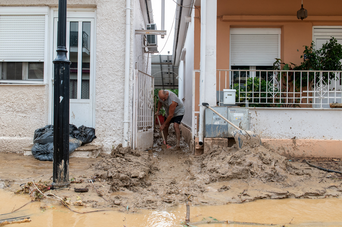 Άνδρας προσπαθεί να καθαρίσει την είσοδο του σπιτιού του από τις λάσπες στο Βόλο, την τρίτη μέρα της κακοκαιρίας DANIEL, την Πέμπτη 7 Σεπτεμβρίου 2023. Κορυφώνεται η αγωνία, όσο περνούν οι ώρες και οι μέρες, για τους ανθρώπους που αγνοούνται στο Βόλο και το Πήλιο και δεν έχουν δώσει σημεία ζωής, ενώ η κακοκαιρία επιμένει με ραγδαίες μπόρες -από το πρωί και κατά τη διάρκεια της νύχτας- με αποτέλεσμα να επιδεινώνονται τα προβλήματα τόσο στον Βόλο, όσο και στο Πήλιο που κυριολεκτικά έχουν υποστεί ανυπολόγιστες καταστροφές. Στους δύο νεκρούς της Μαγνησίας, υπάρχουν και 4 αγνοούμενοι, μεταξύ των οποίων, ένα ζευγάρι 35χρονων Αυστριακών, που η τύχη τους αγνοείται, όταν το σπίτι που παραθέριζαν στα Ποτιστικά του Νοτίου Πηλίου παρασύρθηκε από τους χειμάρρους, ενώ οι ίδιοι βρίσκονταν μέσα σε αυτό. Ο Βόλος είναι χωρίς υδροδότηση και πόσιμο νερό για τρίτη ημέρα και οι Αρχές δίνουν αγώνα για να δώσουν ανάσες ζωής σε μία πόλη που προσπαθεί να επανέλθει σε ένα στοιχειώδες επίπεδο κανονικότητας, μετά τις καταστροφές που προκάλεσε η πρωτόγνωρη κακοκαιρία, ενώ σταδιακά αποκαθίσταται η ηλεκτροδότηση σε όλο