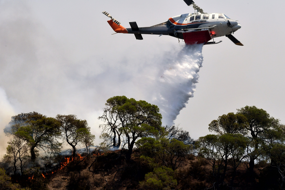 Πυροσβεστικό ελικόπτερο επιχειρεί στην κατάσβεση της πυρκαγιάς που καίει δασική έκταση απέναντι από τις εγκαταστάσεις των διυλιστηρίων της Motor Oil, Τετάρτη 19 Ιουλίου 2023. Μεγάλη είναι η ανησυχία για το Λουτράκι όπου οι πυροσβεστικές δυνάμεις έδωσαν τεράστια μάχη κατά τη διάρκεια της νύχτας και κατάφεραν να μην περάσει η πυρκαγιά κάτω από την εθνική οδό Αθηνών-Κορίνθου. Παράλληλα, η Πυροσβεστική κατάφερε να κρατήσει τη φωτιά σε απόσταση ασφαλείας από τα διυλιστήρια και παραμένει σε επιφυλακή, καθώς ο κίνδυνος δεν έχει περάσει. ΑΠΕ-ΜΠΕ/ΑΠΕ-ΜΠΕ/ΒΑΣΙΛΗΣ ΨΩΜΑΣ
