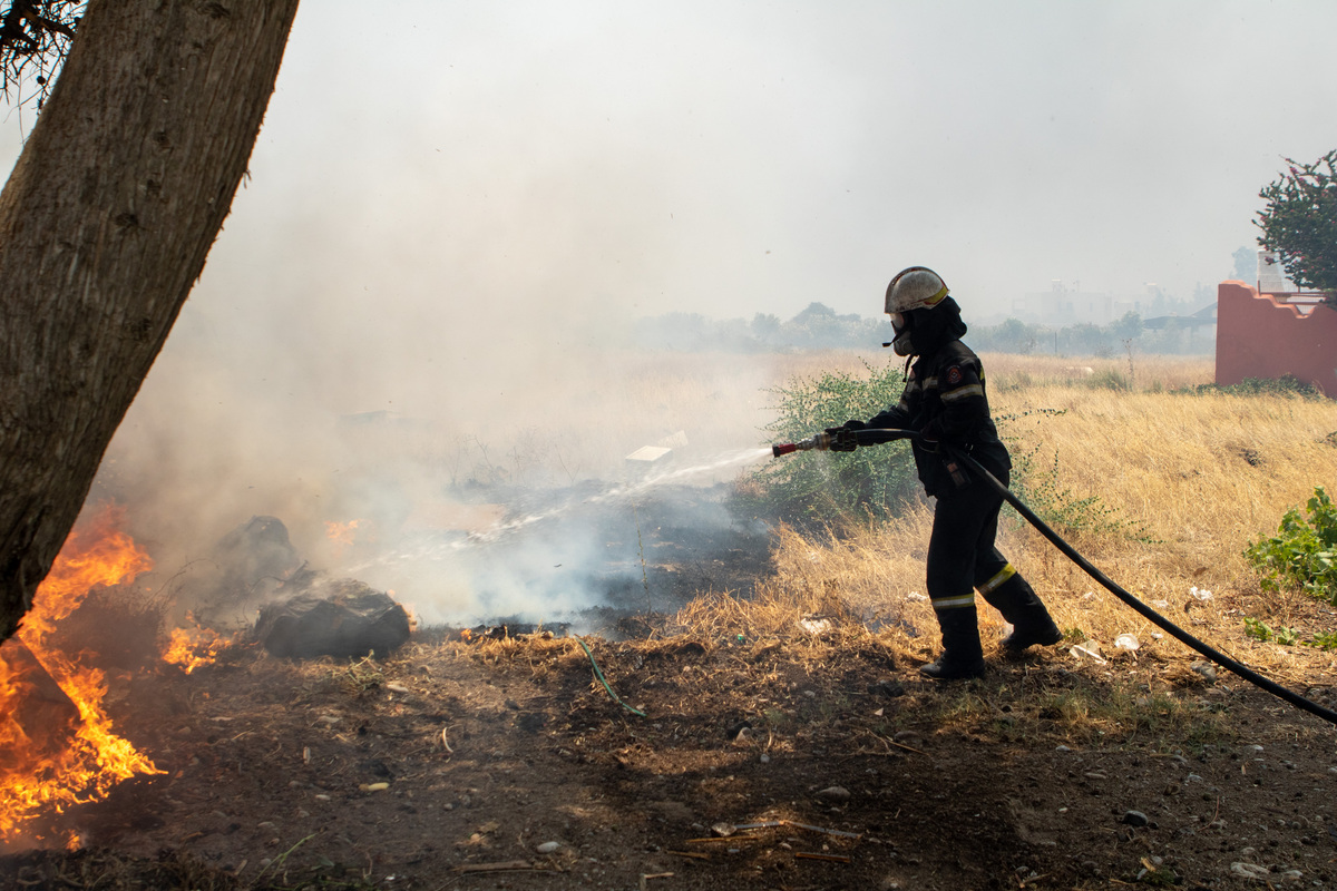 Πυροσβέστης επιχειρεί στην κατάσβεση της πυρκαγιάς στην περιοχή Κιοτάρι της Ρόδου, Δευτέρα 24 Ιουλίου 2023. Μάχη για να μη μπεί η φωτιά στα χωριά Γεννάδι και Βάτι δίνουν οι πυροσβεστικές δυνάμεις και οι εθελοντές, στη νότια Ρόδο. Στην περιοχή έχουν σπεύσει αρκετά πυροσβεστικά οχήματα και εθελοντές ενώ γίνονται και ρίψεις νερού από πυροσβεστικά αεροπλάνα. Πριν από λίγο με εντολή από το 112 αποφασίστηκε η εκκένωση και των δύο χωριών. Μάχη συνεχίζει να δίνεται και στο Ασκληπειό όπου έχουν καεί σπίτια. ΑΠΕ-ΜΠΕ/ΑΠΕ-ΜΠΕ/ΛΕΥΤΕΡΗΣ ΔΑΜΙΑΝΙΔΗΣ