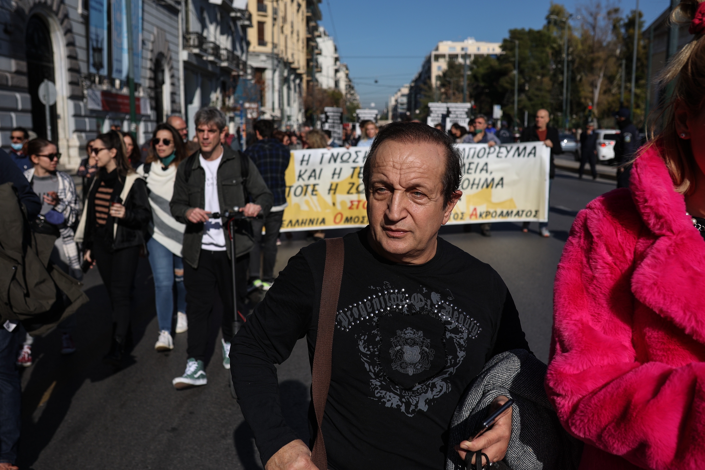 Συγκέντρωση στο υπουργείο πολιτισμού και πορεία διαμαρτυρίας ηθοποιών κατά τηςυποβάθμισης του πτυχίου των δραματικών σχολών, στην Αθήνα, στις 27 Δεκεμβρίου, 2022