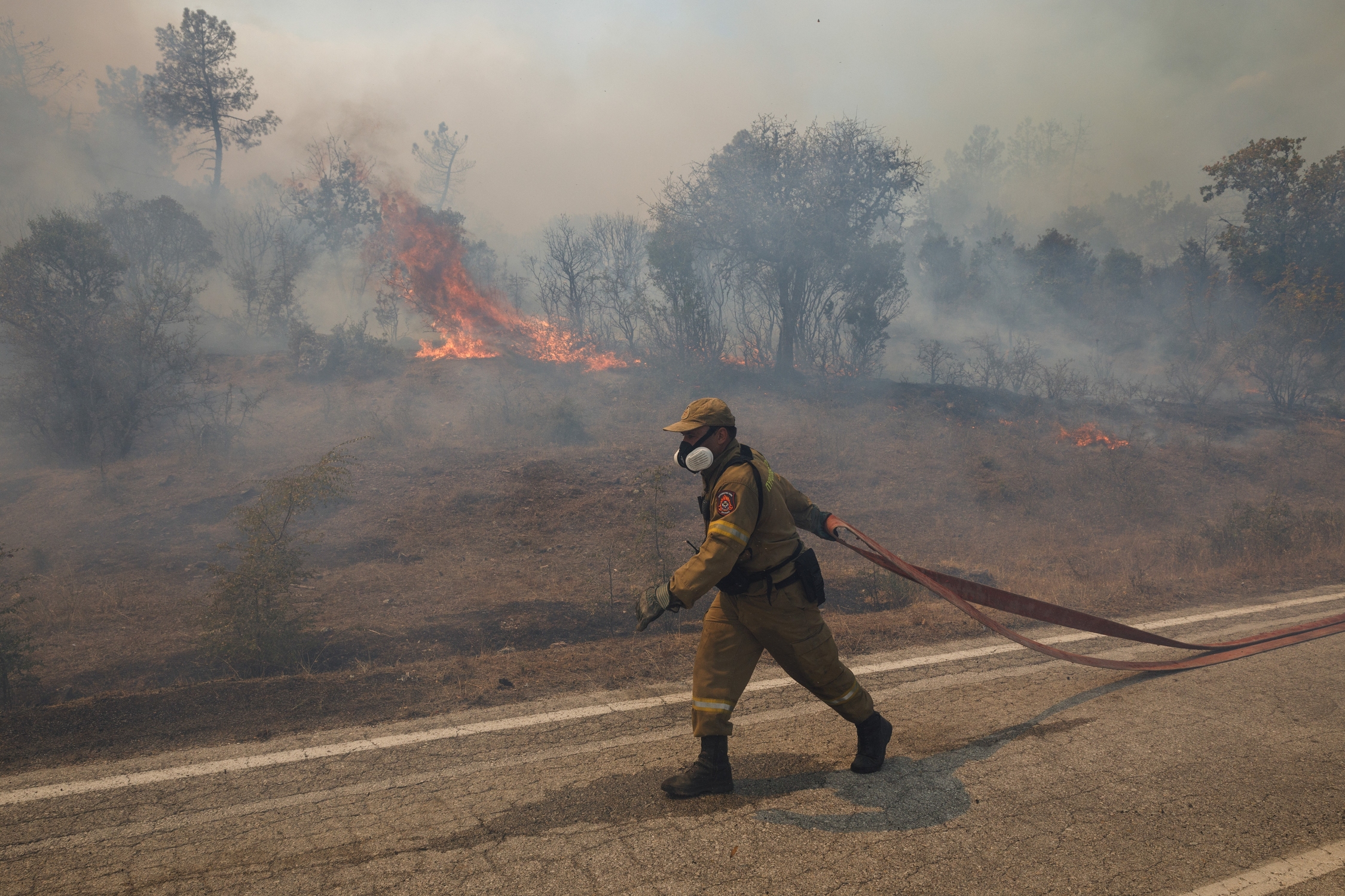 A firefighter rests outside of the village of Kirki, Alexandroupoli, Greece on August 23, 2023. / Πυροσβέστης ξεκουράζεται εξω απο το χωριό Κίρκη, Αλεξανδρούπολη, 23 Αυγούστου 2023.