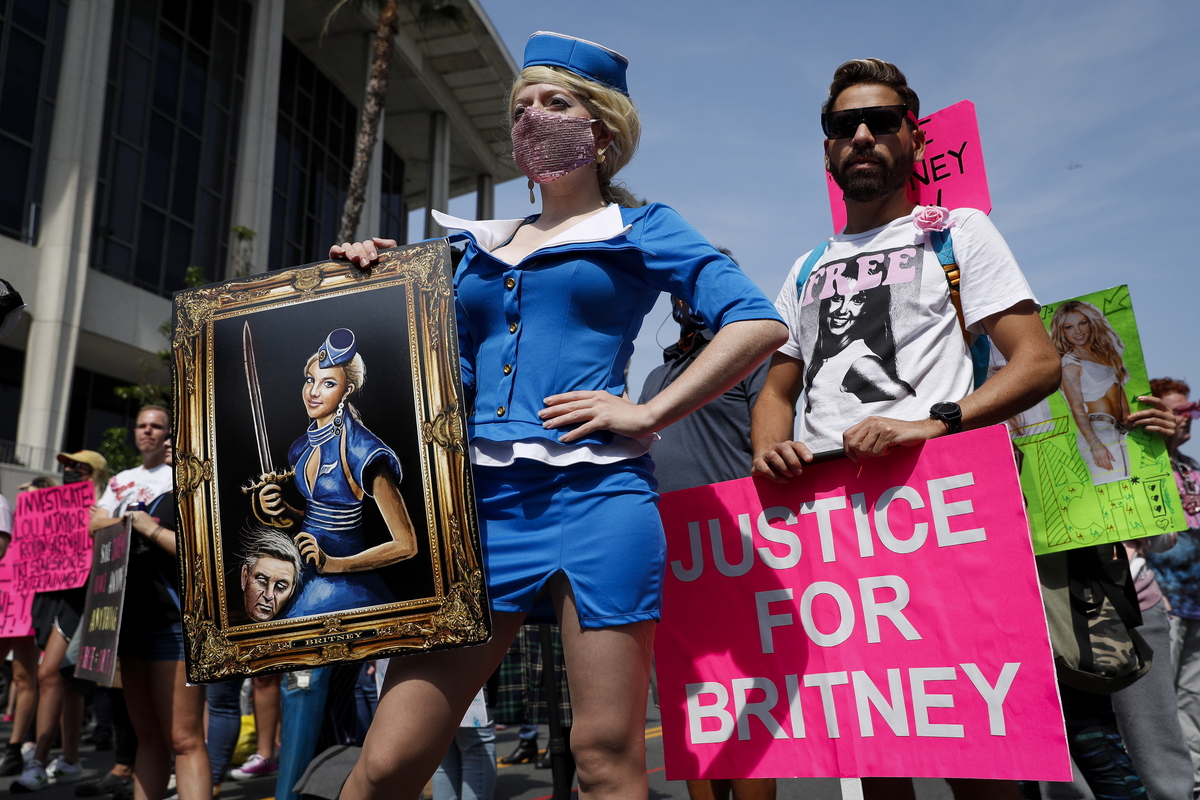 epa09496634 Britney Spears supporters attend a rally outside the Stanley Mosk Courthouse in Los Angeles, California, USA, 29 September 2021. Los Angeles judge Brenda Penny temporarily removed Britney Spears' father, Jamie, from the conservatorship. EPA/CAROLINE BREHMAN