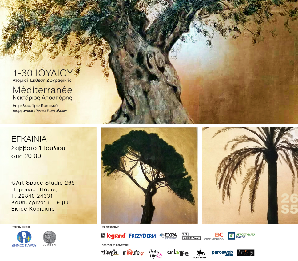 Στον εκθεσιακό χώρο Art Space / Studio 265 στην Παροικιά της Πάρου, που ξεκίνησε τη λειτουργία του το καλοκαίρι του 2016, εγκαινιάζεται το Σάββατο 1 Ιουλίου 2017 η ατομική έκθεση ζωγραφικής του Νεκτάριου Αποσπόρη με τίτλο «Méditerranée».