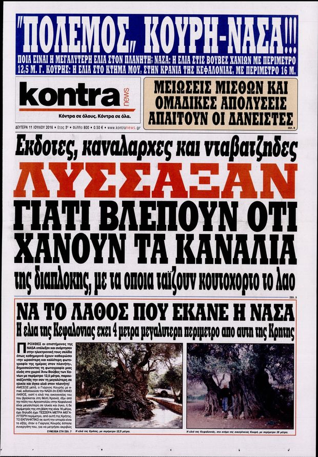 Αφορμή στάθηκε το γεγονός ότι η NASA υποστήριξε ότι το μεγαλύτερο ελαιόδεντρο βρίσκεται στην Κρήτη. Αυτό προκάλεσε τον εκνευρισμό του εκδότη Γιώργου Κουρή που υποστήριξε ότι η μεγαλύτερη ελιά βρίσκεται στον τόπο καταγωγής του, την Κεφαλονιά και μάλιστα στο κτήμα του. Εξού και το πρωτοσέλιδο της χρονιάς.