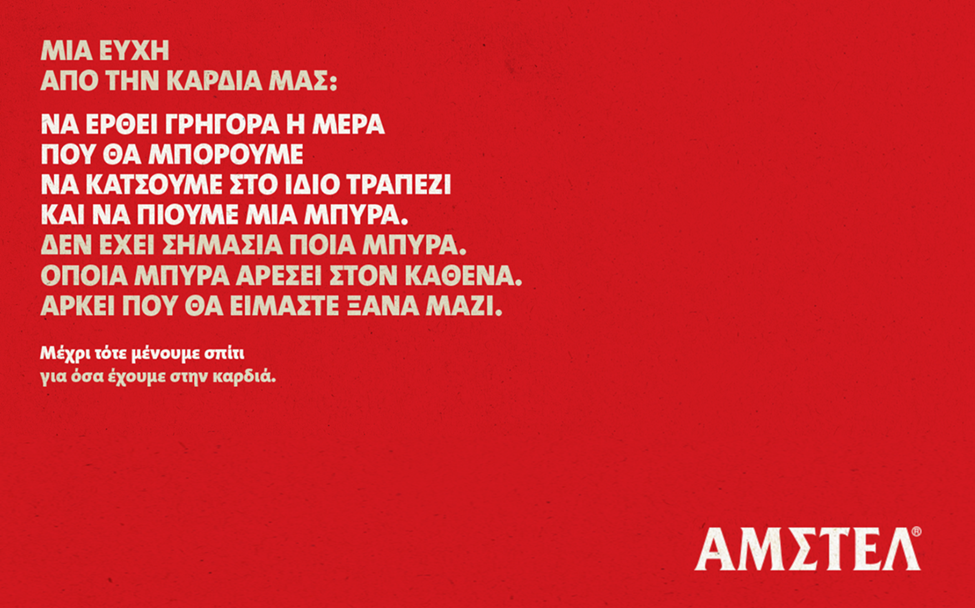Κοιτώ και ξανά κοιτώ το τελευταίο βίντεο της Amstel το οποίο μας προτρέπει να «μείνουμε σπίτι». Δεν είναι περίτεχνο, ένα απλό κόκκινο φόντο που πάνω του πέφτουν λευκά γράμματα. Δεν έχει λούσα και διαφημιστικές φιοριτούρες, μονάχα τη μελωδια απο το τραγούδι, που έχει ντύσει το τηλεοπτικό σποτ της μπύρας. Ακόμη και το logo είναι στριμωγμένο με μικρά γράμματα σε μια γωνία.