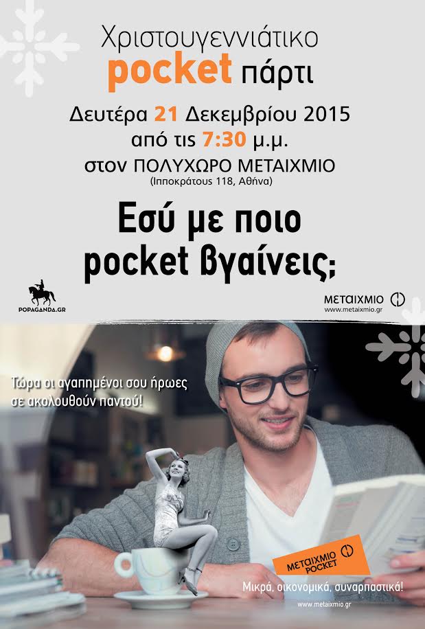 Σας περιμένουμε στον ΠΟΛΥΧΩΡΟ ΜΕΤΑΙΧΜΙΟ (Ιπποκράτους 118, Αθήνα) τη Δευτέρα 21 Δεκεμβρίου 2015, από τις 7:30 το βράδυ, με τις υπέροχες μουσικές επιλογές της POPAGANDA, με άφθονο κρασί και νόστιμους μεζέδες και με πολλές μοναδικές εκπλήξεις που ετοιμάζουμε για εσάς! Ελάτε με συνοδό το αγαπημένο σας pocket, φωτογραφηθείτε μαζί του και μοιραστείτε μαζί μας και με άλλους ιστορίες με τις διαφορετικές στιγμές που σας κράτησε συντροφιά. Επωφεληθείτε ακόμα από τις pocket προσφορές που θα ισχύσουν αποκλειστικά για το πάρτι.