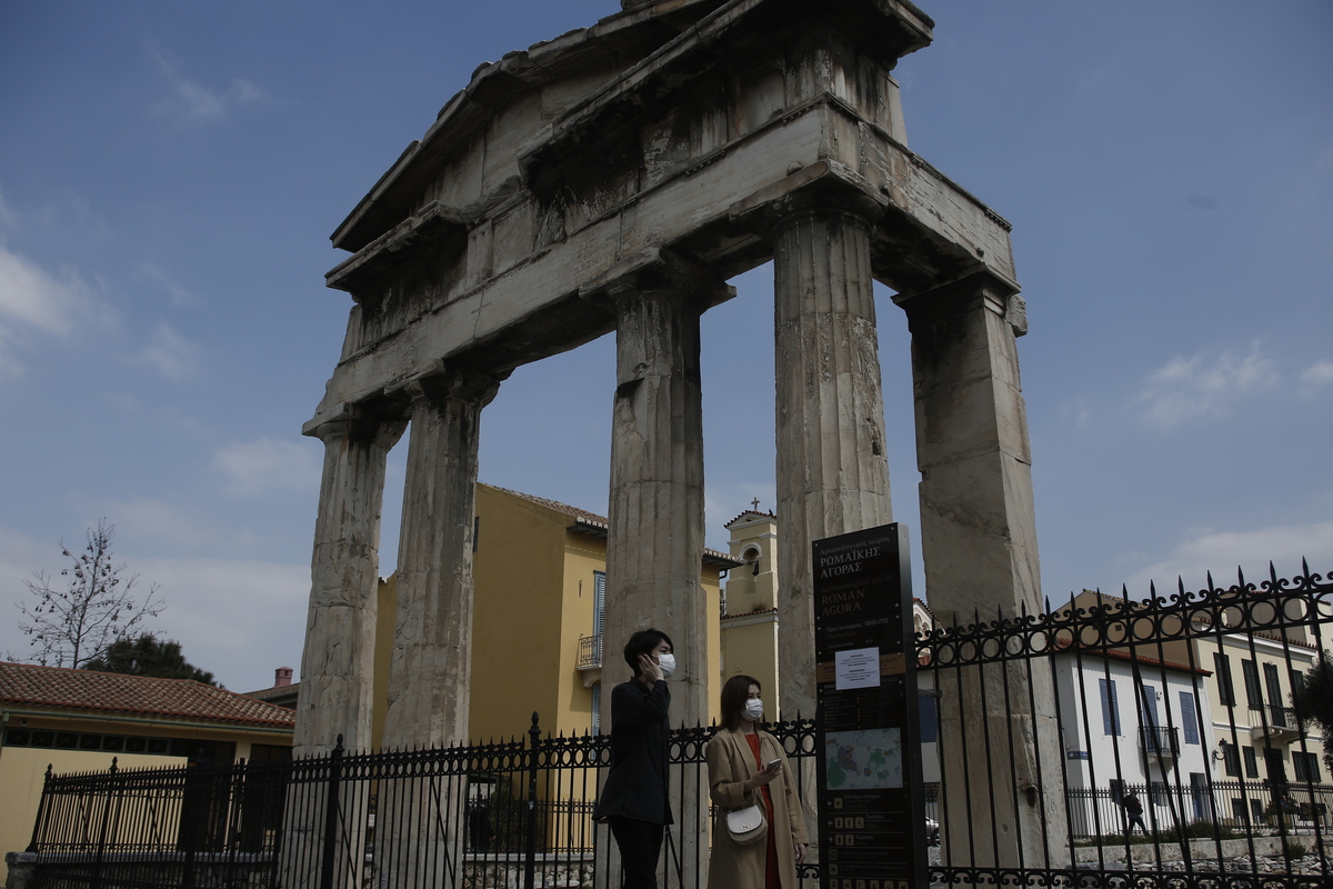Ôïõñßóôåò ìå ìÜóêåò Ýîù áðü áñ÷áéïëïãéêü ÷þñï óôï êÝíôñï ôçò ÁèÞíáò, ìç ìðïñþíôáò íá ìðïõí ìÝóá ãéáôß åßíáé êëåéóôÜ ëüãù ôùí ðñïëçðôéêþí ìÝôñùí ãéá ôïí ðåñéïñéóìü ôçò åîÜðëùóçò ôïõ êïñïíïúïý, ÊõñéáêÞ 15 Ìáñôßïõ 2020. ÁÐÅ ÌÐÅ/ÁÐÅ ÌÐÅ/ÃÉÁÍÍÇÓ ÊÏËÅÓÉÄÇÓ