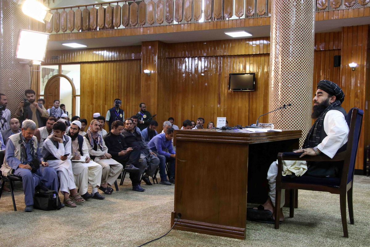 epa09451147 Zabihullah Mujahid, Taliban spokesperson talks with journalists during a press conference in Kabul, Afghanistan, 06 September 2021. The Taliban on 06 September, claimed that their Afghan takeover was complete after they captured Panjshir, the last province held by resistance forces opposed to the Islamist militia. Panjshir was also the center of resistance against the Islamist group during the previous Taliban regime from 1996 to 2001. EPA/STRINGER