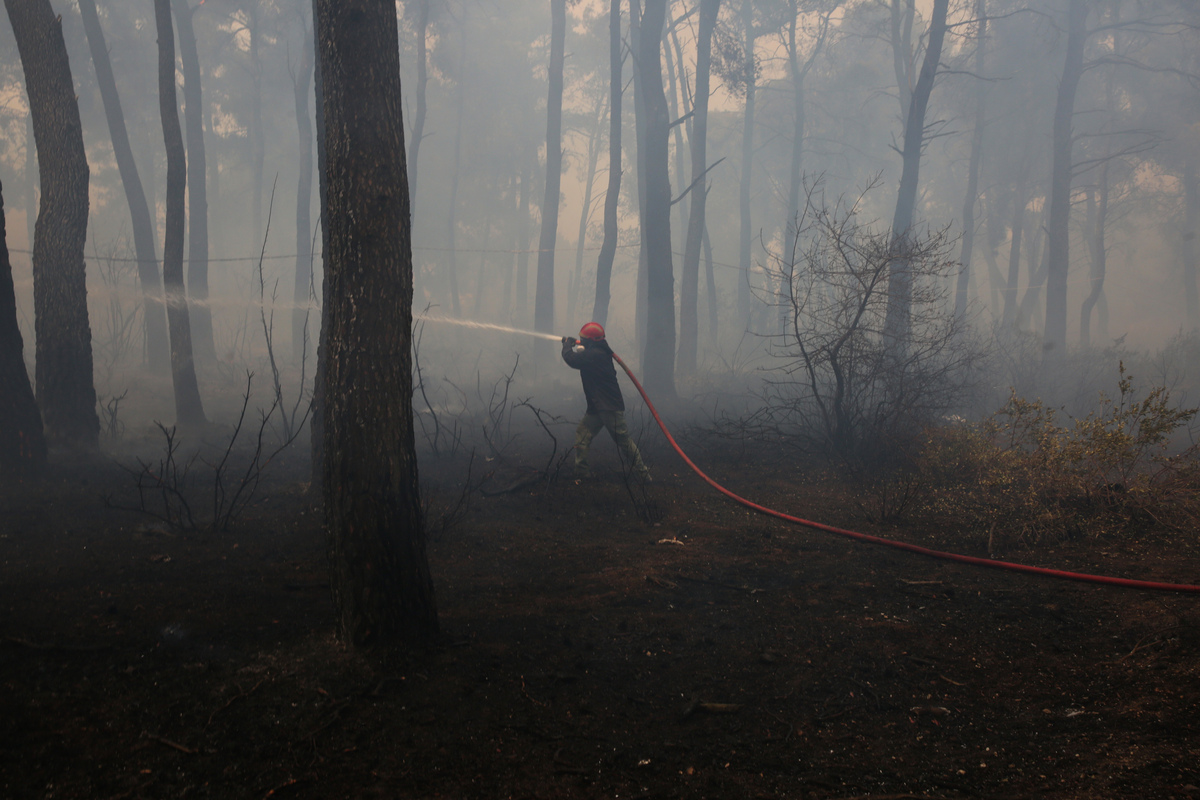 Εθελοντές πυροσβέστες επιχειρούν στην κατάσβεση της πυρκαγιάς στο Κρυονέρι, την Παρασκευή 06 Αυγούστου 2021. Δραματικές ώρες ζει η Αττική, καθώς η πυρκαγιά που αναζωπυρώθηκε χθες το μεσημέρι μαίνεται ανεξέλεγκτα και είναι πλέον μέσα στις Αφίδνες, ενώ κατά τη διάρκεια της νύχτας πέρασε την εθνική οδό προς Καπανδρίτι, στο ύψος των διοδίων, ενώ από την άλλη πλευρά έφτασε στην Ιπποκράτειο Πολιτεία. Βιβλική είναι η καταστροφή στη βόρεια Εύβοια, εξαιρετικά δύσκολα είναι τα πράγματα στην Ηλεία και τη Μεσσηνία, ενώ, σύμφωνα με τις προβλέψεις, σήμερα αναμένονται ισχυροί άνεμοι και η προοπτική εξέλιξής τους προκαλεί εφιάλτη στους επιτελείς της Πυροσβεστικής και της Πολιτικής Προστασίας. Από τις 6:00 έχουν αρχίσει να επιχειρούν και τα εναέρια μέσα τόσο στην Αττική όσο και στις άλλες μεγάλες πυρκαγιές, ενώ ξεκινούν και οι 83 Γάλλοι πυροσβέστες που έφτασαν στη χώρα μας λίγο μετά τη 1:00. Κατά τη διάρκεια της ημέρας αναμένεται βοήθεια και ακόμη δύο αεροσκάφη καναντέρ από τη Γαλλία, καθώς και βοήθεια από άλλες έξι χώρες που ανταποκρίθηκαν στο αίτημα που υπέβαλε η Ελλάδα. ΑΠΕ-ΜΠΕ/ΑΠΕ-ΜΠΕ/ΟΡΕΣΤΗΣ ΠΑΝΑΓ