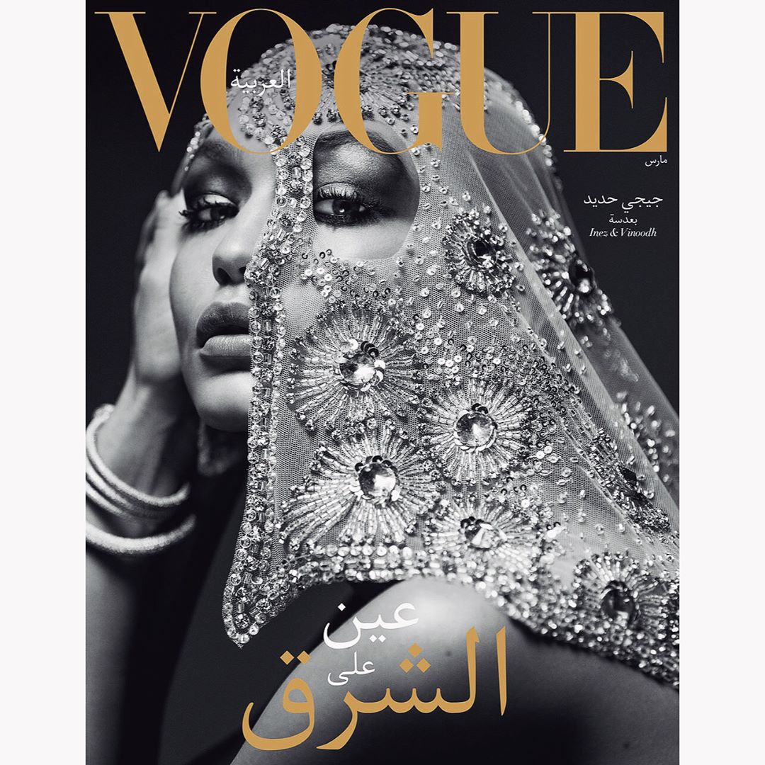 Η Χαντίντ εμφανίζεται σε δύο διαφορετικές φωτογραφίες για το εξώφυλλο του Vogue Arabia έχοντας στο κεφάλι της μια κεντημένη μαντίλα.