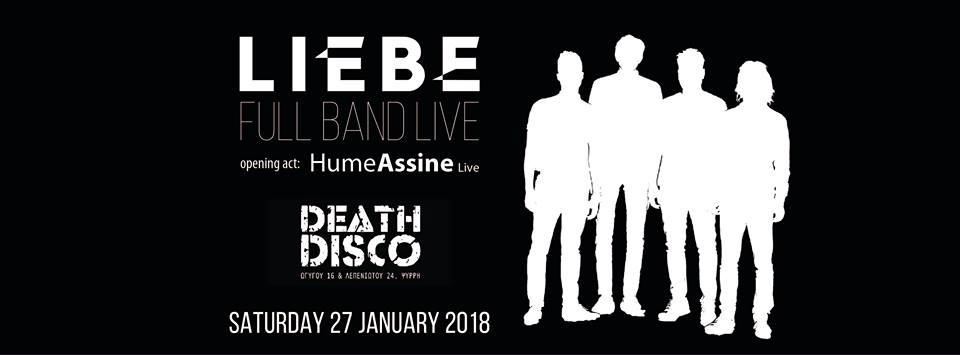 Οι Liebe από τα αγαπημένα πια σχήματα της pop στην Ελλάδα , με 4 άλμπουμ στο ενεργητικό τους (Club Royal , Somewhere in time , Airport, Revolution of love) το Σάββατο 27 Ιανουαρίου 2018 για πρώτη φορά στη σκηνή του Death Disco στην Αθήνα , για να παρουσιάσουν τραγούδια από τα 4 άλμπουμς και νέο υλικό από τον επερχόμενο δίσκο. Τη συναυλία ανοίγουν οι Hume Assine.
