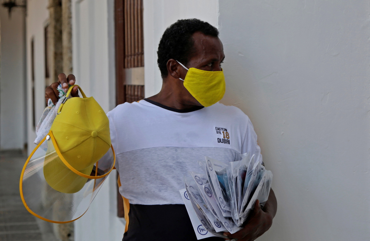 epa08598058 A man sells face masks in Cartagena, Colombia, 11 August 2020. Despite showing progress in the fight against the coronavirus, Cartagena maintains strict measures to control mobility and social isolation. Five months after of having detected the first case of COVID-19 in Cartagena de Indias, slowly begins to win the battle against the coronavirus, that to date, according to the official report, has claimed the lives of 490 Cartagena and reaches 17,333 confirmed cases. EPA/Ricardo Maldonado Rozo
