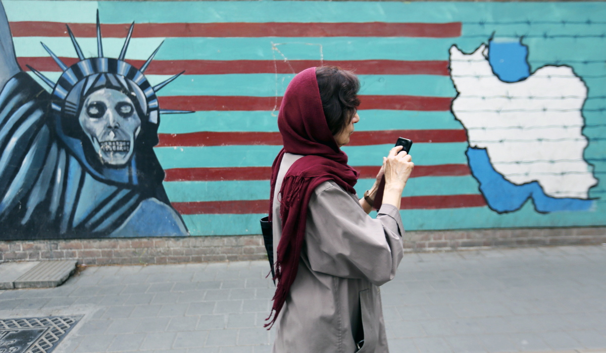 epa06720068 An Iranian woman holding her cell phone walk past an anti-US mural in front of the former US embassy in Tehran, Iran, 08 May 2018. US president Donald Trump on 08 May 2015 announced that US will withdraw from the nuclear deal. Foreign ministers from six world powers and Iran finally achieved an agreement to prevent the Islamic republic from developing nuclear weapons, Western diplomats said in Vienna on 14 July 2015. EPA/STRINGER