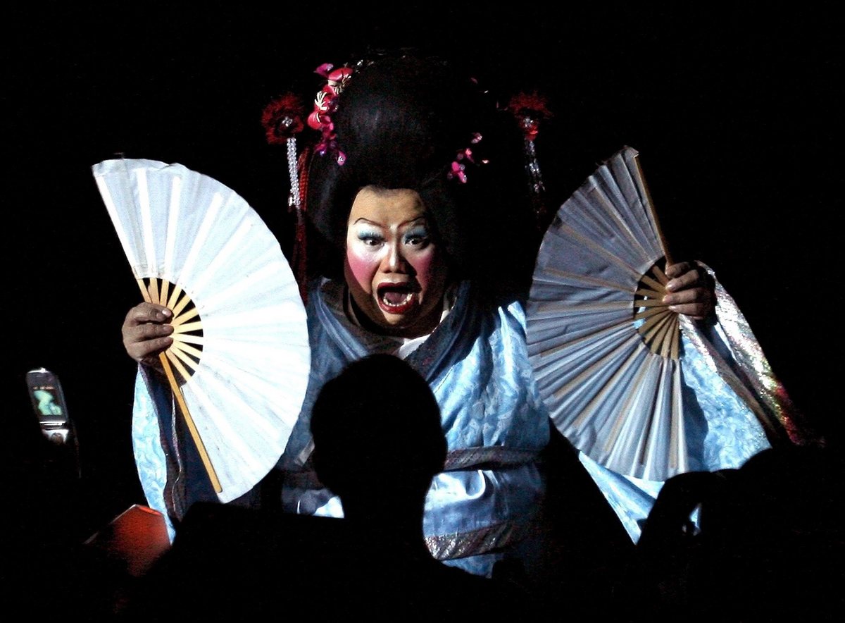 epa00949917 A ladyboy dressed as a Japanese ' beauty ' shocks an audience member with a scream during a comedy number in the Mambo Cabaret, said to be the 'Queen' of Bangkok's drag shows, Tuesday 06 March 2007 in Bangkok, Thailand. Filled with glitz, glamour and humour the ladyboy cabaret, draws mostly full houses for its two nightly shows, seven days a week. In Thailand, lady-boys known as kathoeys, or men who dress and behave as women, are a visible and accepted part of society. EPA/BARBARA WALTON