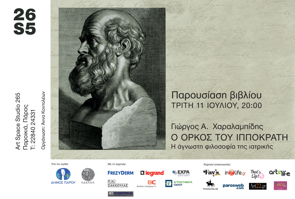 Ο Γιώργος Χαραλαμπίδης παρουσιάζει το νέο του βιβλίο με τίτλο «Ο Όρκος του Ιπποκράτη», την Τρίτη 11 Ιουλίου στις 20:00, στο πλαίσιο των πολιτιστικών εκδηλώσεων που λαμβάνουν χώρα στον εκθεσιακό χώρο Art Space / Studio 265 στην Παροικιά της Πάρου.
