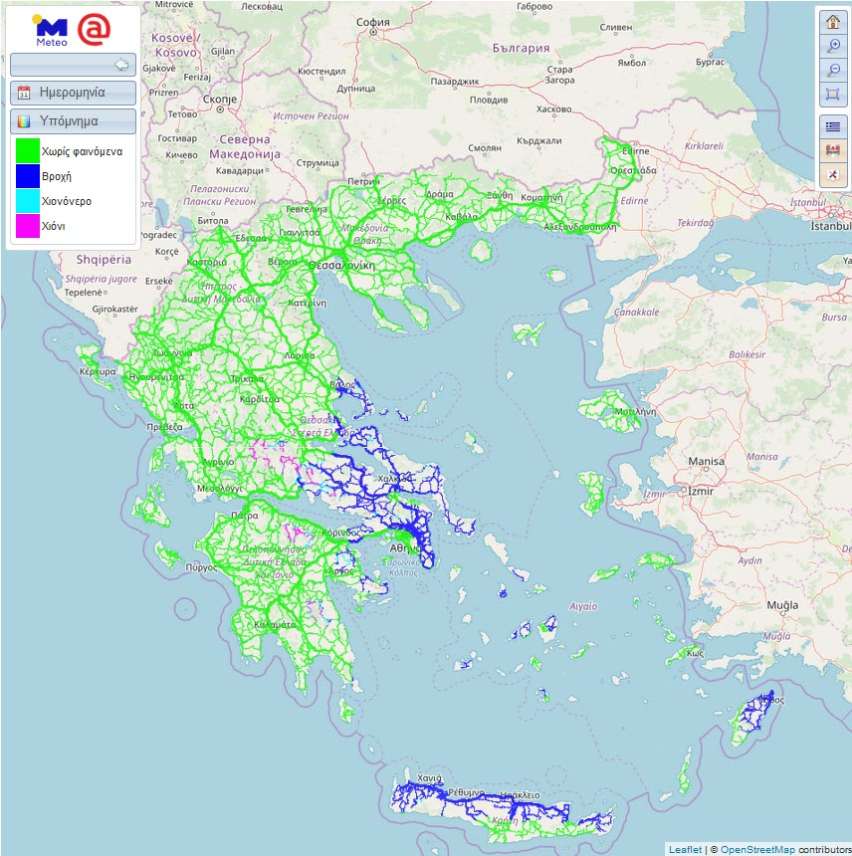 Στο χάρτη που ακολουθεί παρουσιάζονται οι καιρικές συνθήκες που θα επικρατούν στο οδικό δίκτυο της χώρας κατά το μεσημέρι της Τετάρτης. Πιθανά μικροπροβλήματα ή δυσκολία στην οδήγηση θα υπάρχουν κυρίως στο οδικό δίκτυο της Ανατολικής Στερεάς, της Μαγνησίας, της Εύβοιας, του Νοτίου Αιγαίου και της Κρήτης, όπου αναμένονται βροχοπτώσεις.