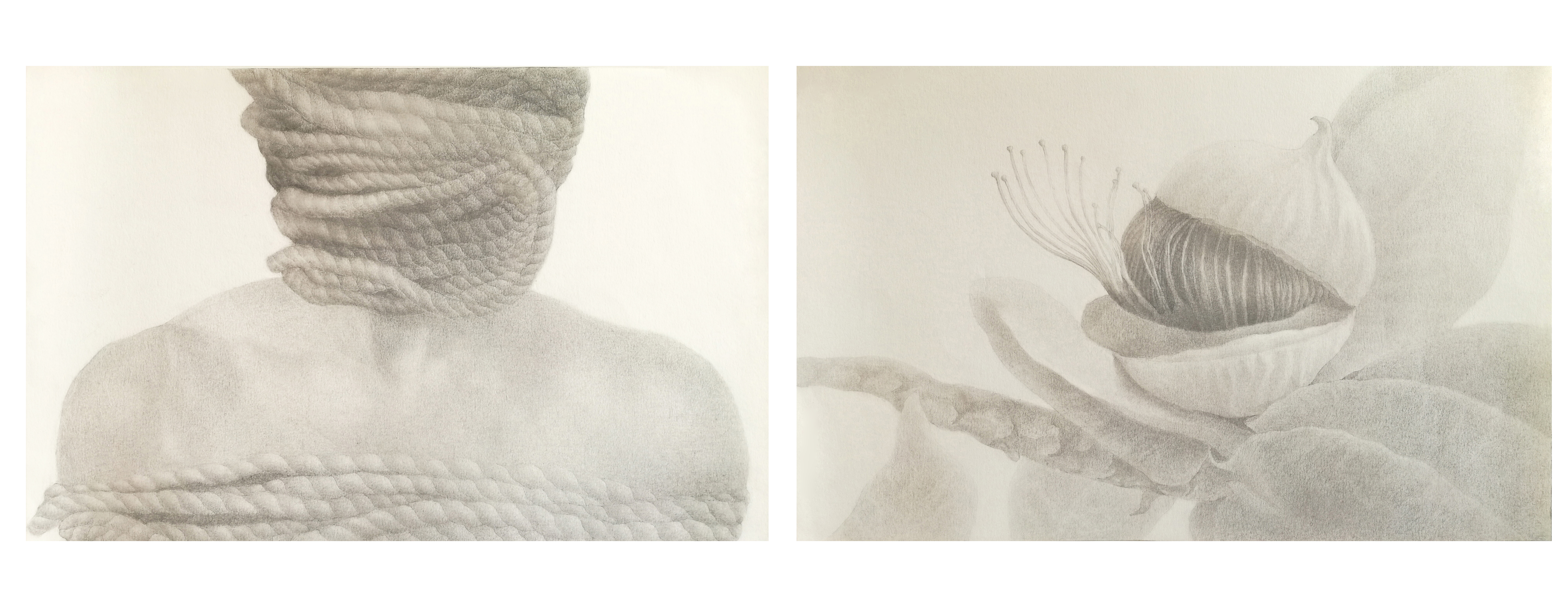 Η Χαρά Πιπερίδου που συμμετέχει (Hara Piperidou, “Gradations of Vocals”, from the series “Objection to Dictation, “diptych, pencil on fine art paper, 2018, Χαρά Πιπερίδου, “Gradations of Vocals”, από τη σειρά ” Objection to Dictation”, δίπτυχο, μολύβι σε χαρτί, 2018) μας είπε για το έργο της: «Στο πλαίσιο ενός στοχασμού που εγγίζει κυρίως αντιφατικές, αντικρουόμενες έννοιες, διερευνώ μορφές αιχμαλωσίας και απελευθέρωσης. Η καρποφορία-ανθοφορία συνεπάγεται αβίαστη ανάπτυξη ενός φυτικού οργανισμού.