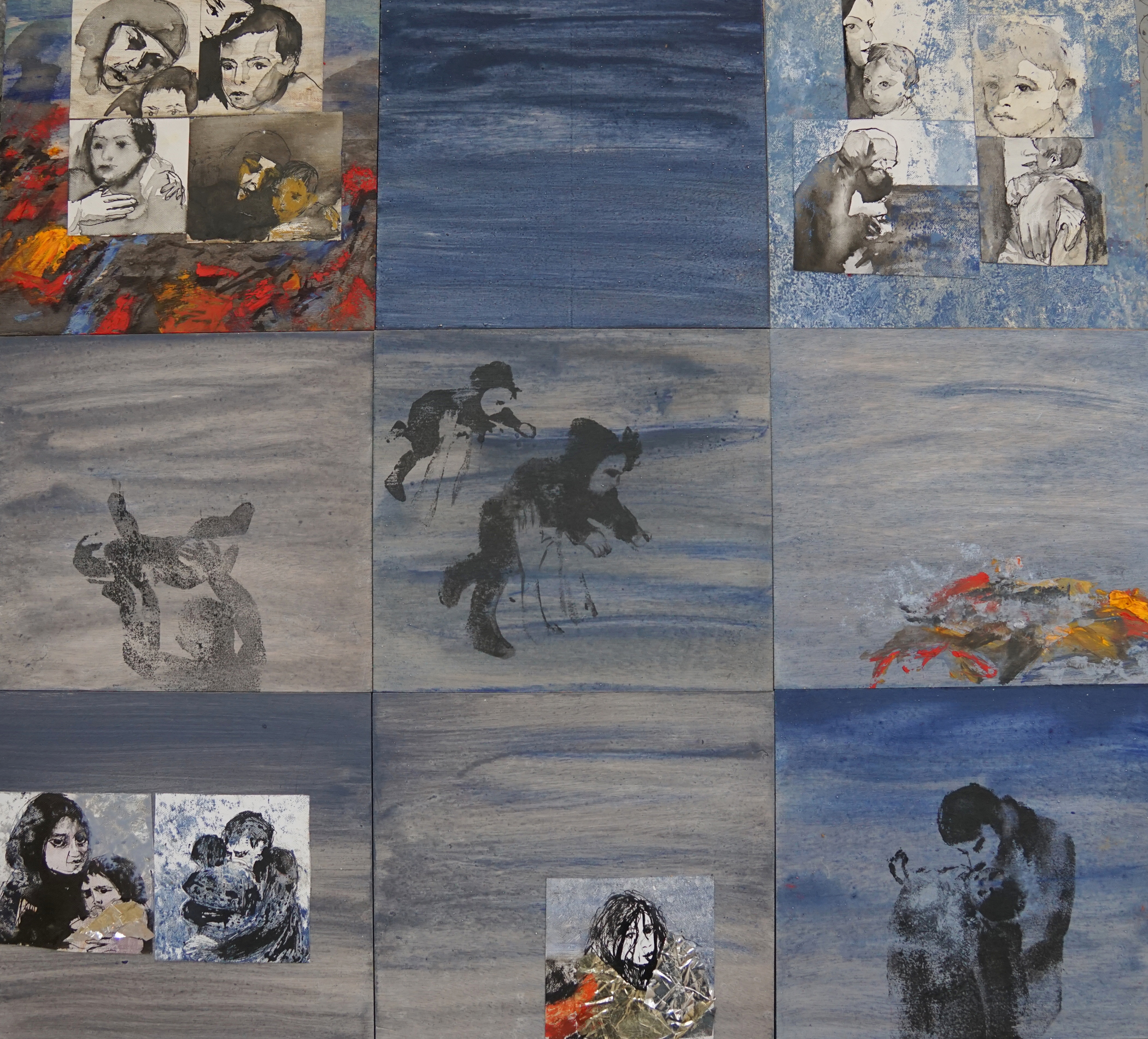 Πορεία με τα πόδια πλήθους ανθρώπων σε τοπίο ρευστό, πρόσωπα παιδιών ανάμεσα σε γη και θάλασσα που δεν τα ρούφηξε η άβυσσος, αφού ταξίδεψαν μέσα στη νύχτα.