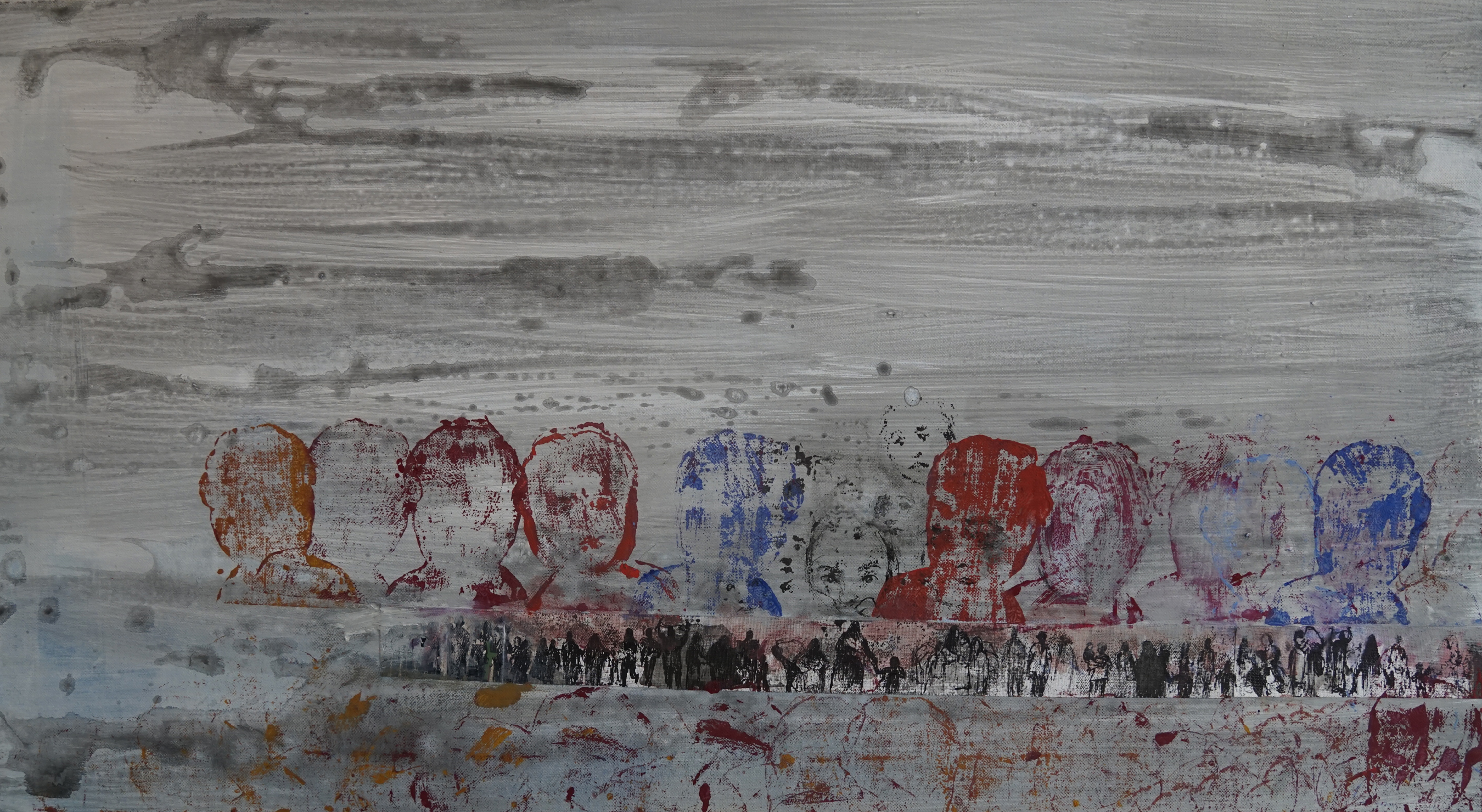 Πορεία με τα πόδια πλήθους ανθρώπων σε τοπίο ρευστό, πρόσωπα παιδιών ανάμεσα σε γη και θάλασσα που δεν τα ρούφηξε η άβυσσος, αφού ταξίδεψαν μέσα στη νύχτα.